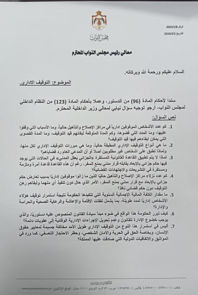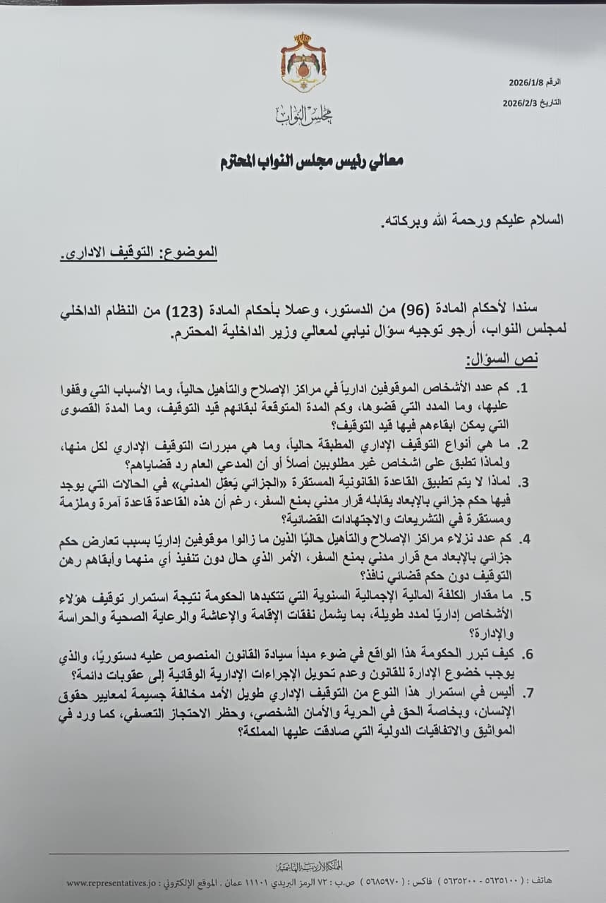 سؤال نيابي حول قانونية التوقيف الإداري ومدى توافقه مع المواثيق الدولية