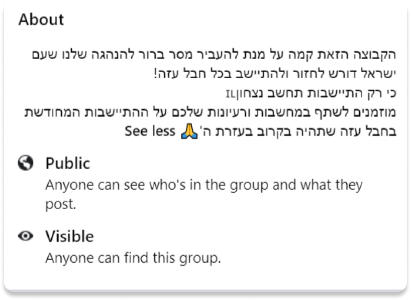 ضمت المجموعة أكثر من ثمانية آلاف عضو، دأبوا على نشر محتوى يطالب بتنظيم الفعاليات والأنشطة الرامية إلى احتلال غزة بالكامل، وتحويلها إلى مستوطنة إسرائيلية. ولم تنسب المجموعة نفسها إلى أيّ فصيل سياسي، لكنّ مديرها اعتاد نشر مقولات، ومقاطع فيديو للسياسي موشيه فيجلين.