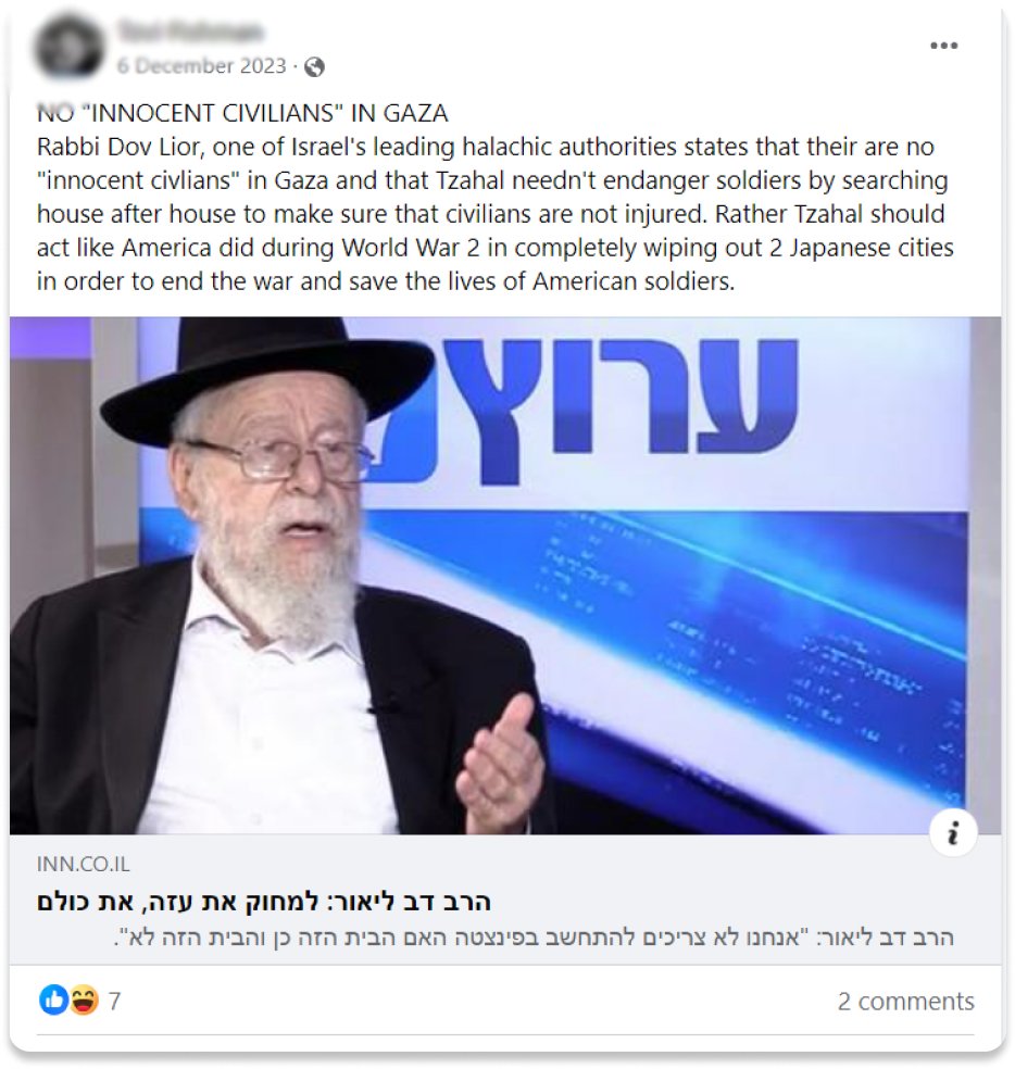 في المقابل، نشر الكاتب الإسرائيلي تزيفي فيشمان عبر صفحته على فيسبوك محتوى بعنوان: "لا يوجد مدنيون أبرياء في غزة". ونقل فيشمان عن الحاخام دوف ليئور -كبير الحاخامات في الخليل- قوله إن "الجيش الإسرائيلي لا يحتاج إلى تعريض جنوده للخطر من خلال تفتيش منزل تلو الآخر، للتأكد من عدم إصابة المدنيين، بل يجب عليه أن يحذو حذو أميركا في الحرب العالمية الثانية، عندما أبادت مدينتين يابانيتين بالكامل؛ من أجل إنهاء الحرب، وإنقاذ حياة الجنود الأميركيين".