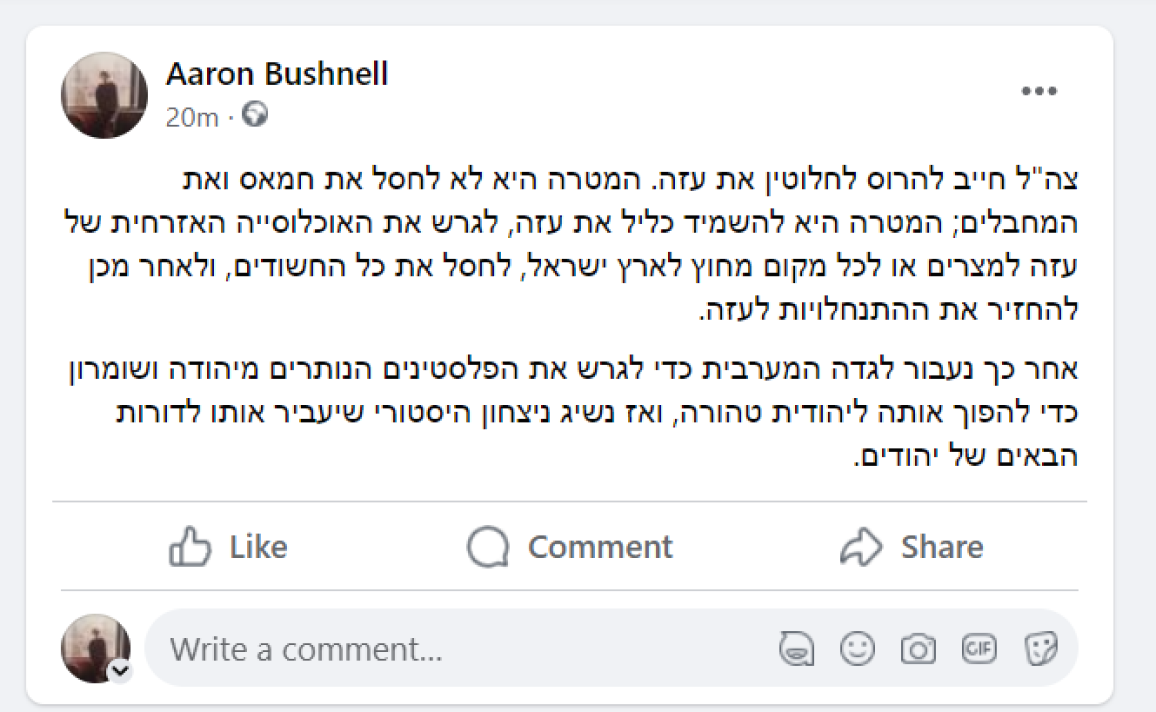 المنشور العنيف: "يجب على الجيش الإسرائيلي أن يدمر غزة بالكامل. الهدف ليس القضاء على حماس والإرهابيين، بل تدمير غزة ككل، وترحيل المدنيين من غزة إلى مصر، أو إلى أيّ مكان خارج دولة إسرائيل؛ للقضاء على جميع المشتبه فيهم، ومن ثم إعادة الاستيطان إلى غزة، والمضي قدماً نحو الضفة الغربية لطرد من تبقى من الفلسطينيين". |