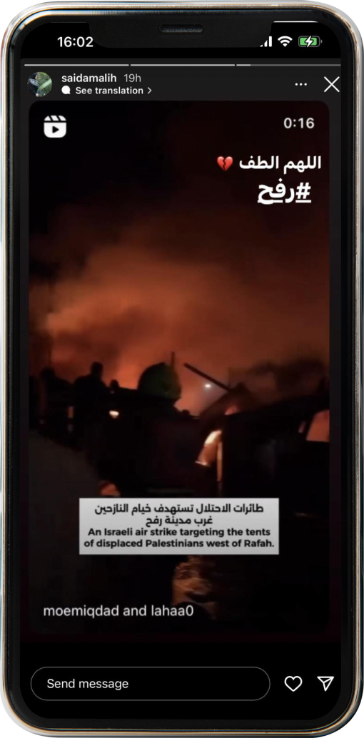 اعتادت الزميلة الصحفية المغربية، سعيدة الملاح، نشر مستجدات الحرب في غزة عبر حساباتها على منصات التواصل الاجتماعي، بصفتها صحفية معنية بتغطية الحرب. لكن وبعد نشرها صوراً عمّا عرف إعلامياً بـ "محرقة الخيام" -وهي غارة نفذها سلاح الجو الإسرائيلي في 26 أيار/مايو 2024 في رفح، أدت إلى مقتل ما لا يقل عن 45 فلسطينياً أغلبهم من النساء والأطفال- توقف حسابها على منصة "إنستغرام"، ولم تستطع استرجاعه إلا بصعوبة. ترجع سعيدة هذا "الخلل التقني" في حسابها إلى نشرها محتوى يوثّق الانتهاكات الحقوقية أثناء الحرب في غزة.