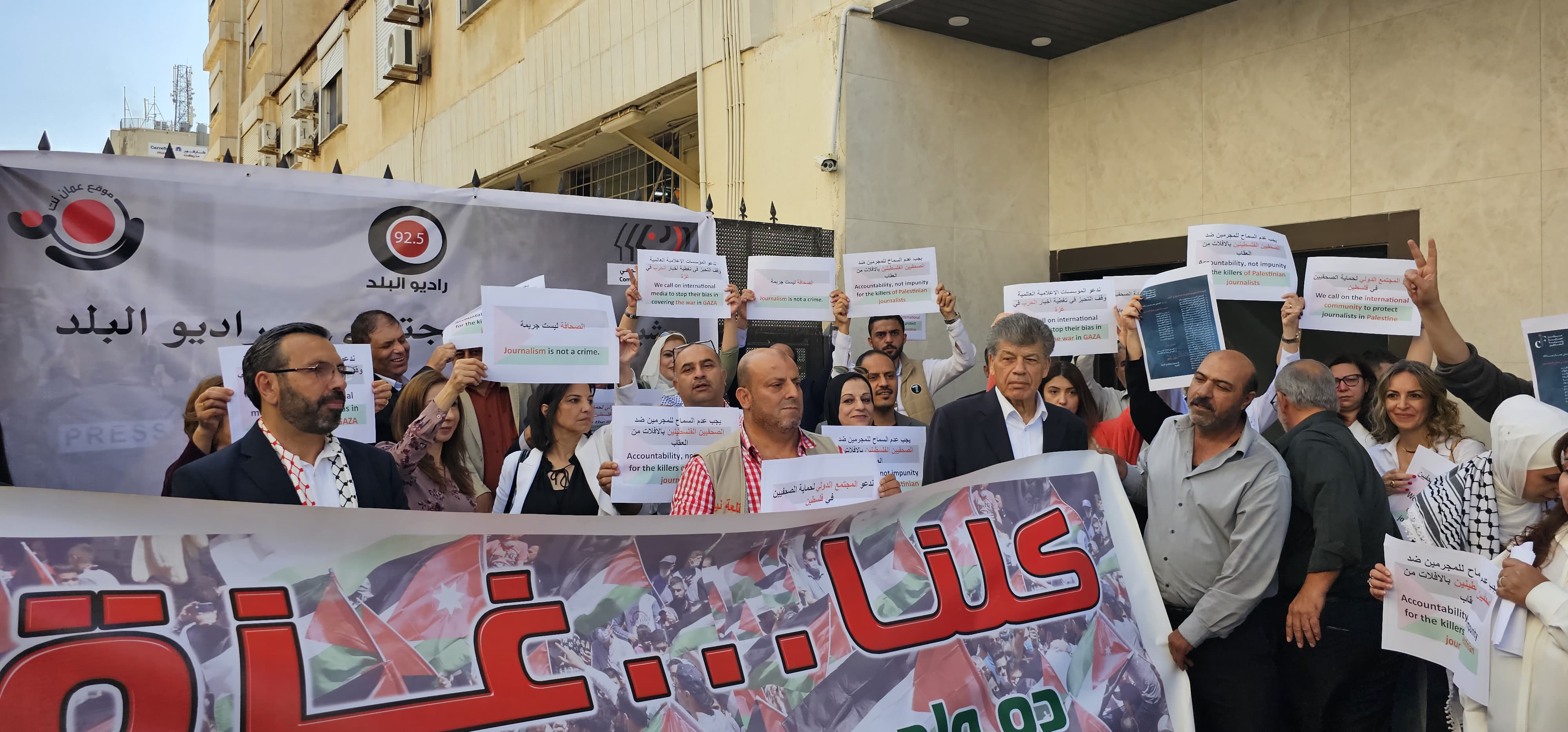 وتأتي الوقفة من شبكة الإعلام المجتمعي بالتزامن مع مكاتبها واستديوهات راديو البلد من شارع وادي صقرة إلى ضاحية الرشيد. وشارك بالوقفة صحفيون وصحفيات وناشطون وناشطات في مؤسسات مجتمع مدني وقطاعات عمالية مختلفة.