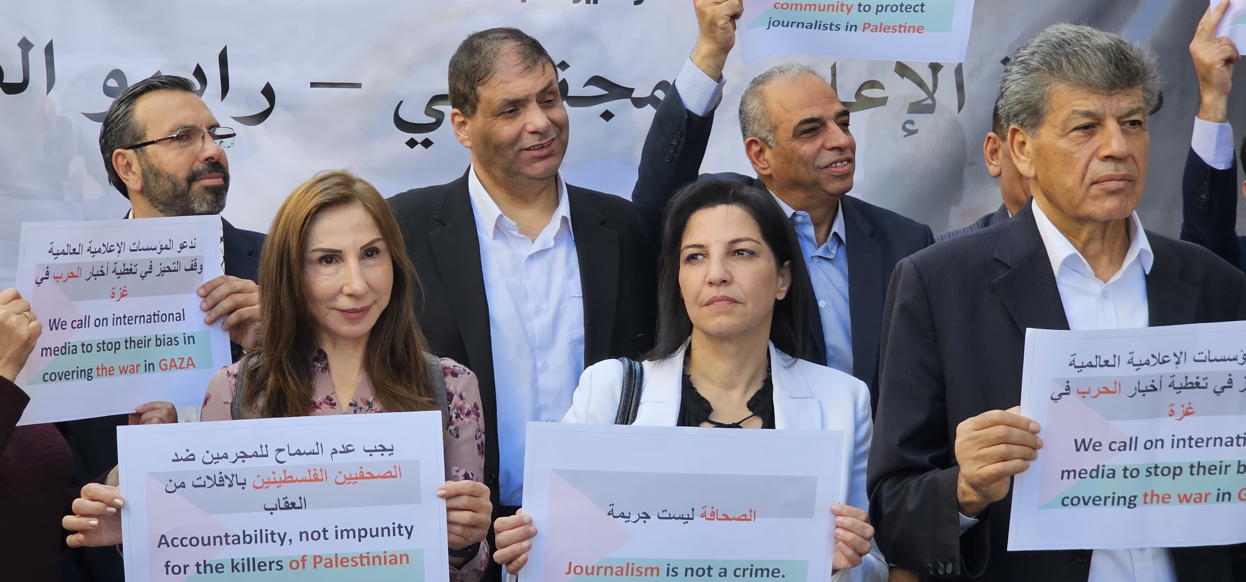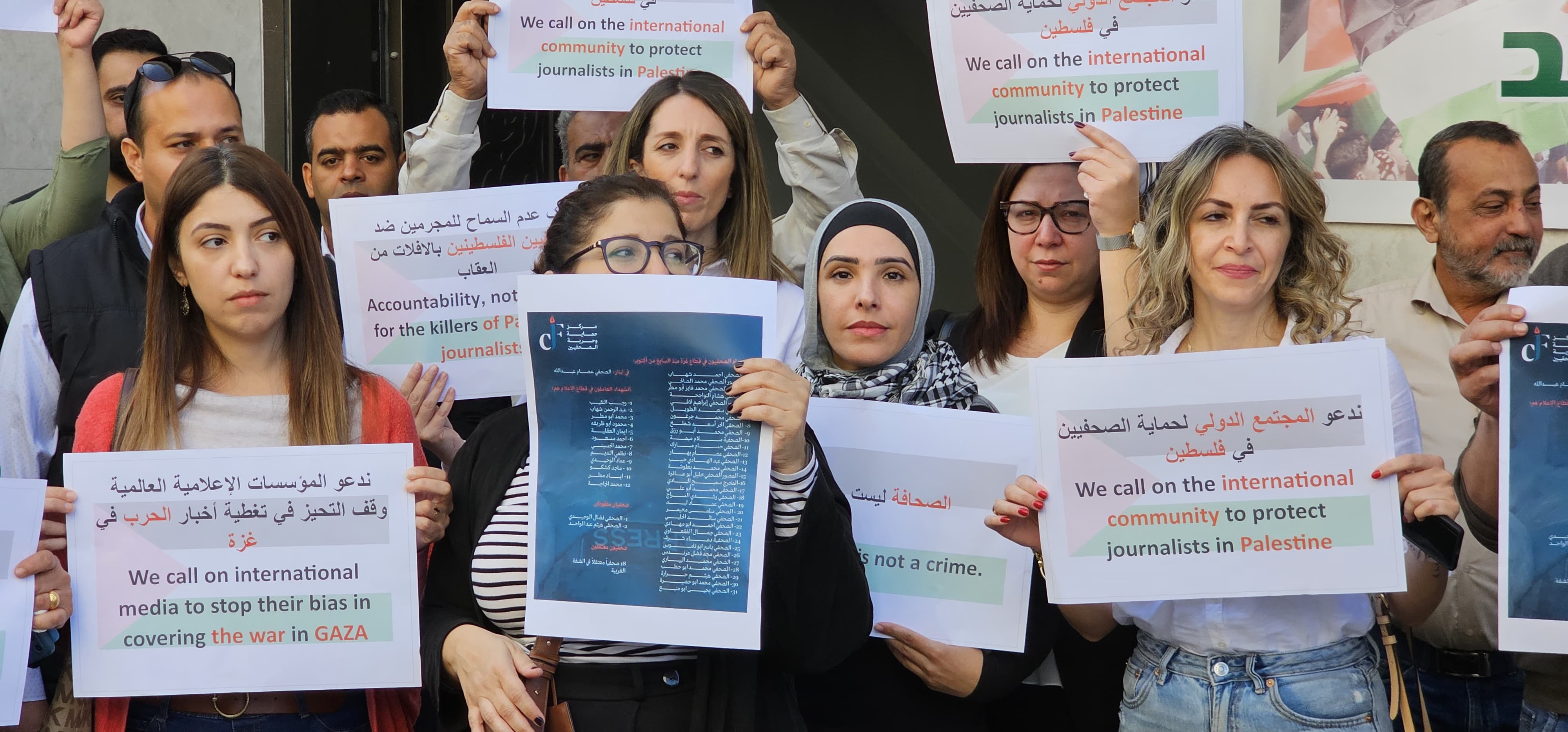 وقال المدير العام لشبكة الإعلام المجتمعي داود كتاب إن 31 صحفي و 12 عامل في مجالات إعلامية تم قتلهم، ولغاية الآن هناك صحفيان مفقودان وذلك حسب، كما تحدث عن هدم 60 مؤسسة صحفية إعلامية وقتل 200 فلسطيني من عائلات الصحفيين .