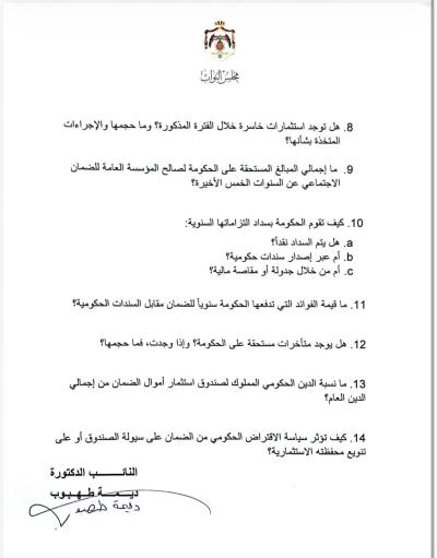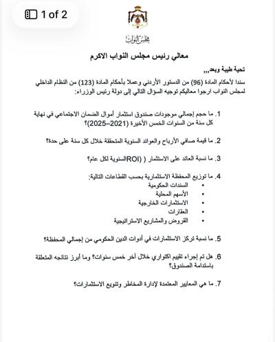 وجهت النائب ديما طهبوب حزمة من الأسئلة النيابية الرقابية إلى رئيس الوزراء، استناداً لأحكام المادة (96) من الدستور، للمطالبة بكشف الحقائق المالية المتعلقة بصندوق استثمار أموال الضمان الاجتماعي للفترة ما بين (2021-2025)، في خطوة تهدف إلى تفعيل الرقابة على "محفظة الأردنيين" وضمان استدامتها للأجيال القادمة.