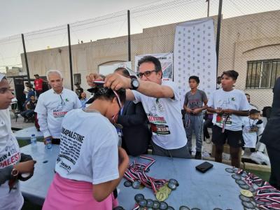 وقطع العداؤون من أعمار مختلفة مسافة خمسة كيلومترات، مرتدين قمصانا كتب عليها "أركض من أجل فلسطين".
