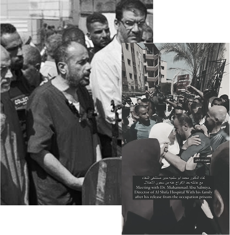 اعتُقل الدكتور محمد أبو سلمية، المدير العام لمستشفى الشفاء في شمال غزة، أثناء عبوره إحدى نقاط التفتيش مع قافلة من سيارات الإسعاف والمرضى، بعد أن طلب منه الجيش الإسرائيلي إخلاء المستشفى في تشرين الثاني/نوفمبر 2023.