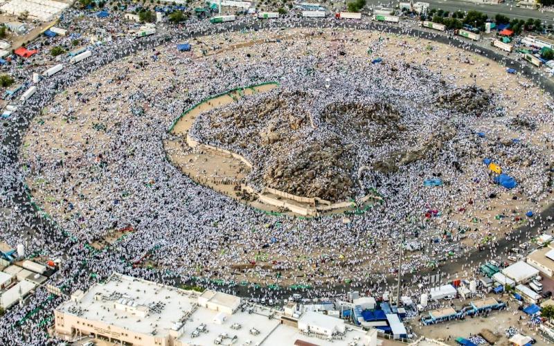 على بعد كيلو مترا من بداية عرفات، ثقلت خطى أم محمد والجمع، زاغت عيونهم وتراءى لهم السراب، تقول" فرن، كما لو أني وضعت رأسي بفرن، مع اني أحمل مظلة!" ارتمى الحجاج على الرصيف مبللة ملابسهم بالعرق؛ ليتفيئوا تحت شجيرات لا تكاد تمسح عنهم تعب أو تنقذهم بنسمة هواء في عرفات، والتي تمتد مساحتها على أرض مستوية لنحو 10كم مربع وتبعد عن مكة نحو 20كم.