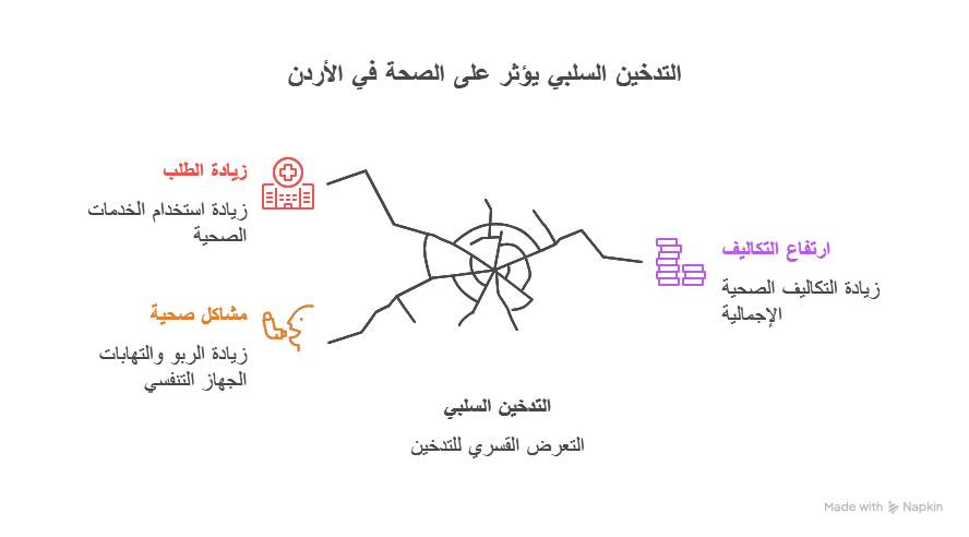 | تكلفة علاج الأمراض المباشرة | ~1.42 مليار | ~2.10 مليار | تتجاوز الإيرادات الضريبية بـ 420 مليون د.أ.