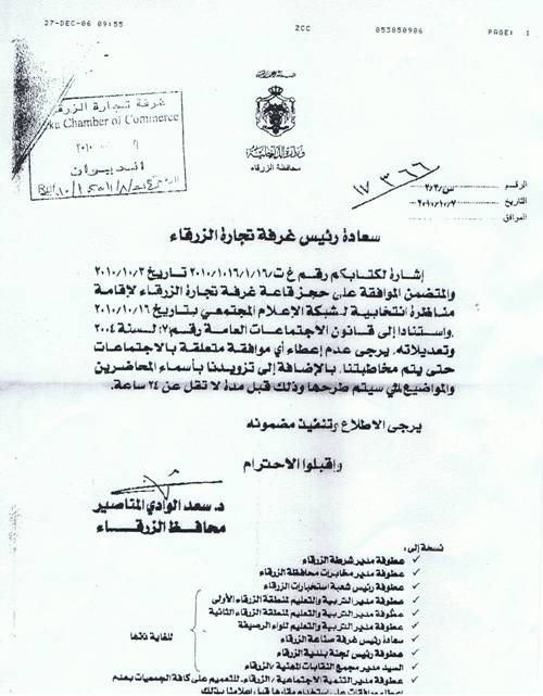 رفض محافظ الزرقاء سعد الوادي المناصير طلب إجراء مناظرة انتخابية تقدمت بها شبكة الإعلام المجتمعي (راديو البلد) لإقامتها بين عدد من مرشحي الدائرة الأولى في الزرقاء، وذلك دون إبداء الأسباب. كما خاطب المناصير غرفة تجارة الزرقاء التي وافقت على حجز إحدى قاعاتها مسبقاً لإجراء المناظرة، طالباً منها بموجب كتاب رسمي عدم الموافقة على حجز القاعة إلا بعد مخاطبة المحافظ وتزويده بأسماء المحاضرين والمواضيع التي سيتم طرحها. ومنع هذا القرار مئات المدعوين من فرصة الاستماع إلى برامج ورؤية المرشحين لمختلف القضايا وتحديداً فيما يتصل بعنوان المناظرة "البطالة والبيئة" باعتبارهما القضيتين الأبرز في محافظة الزرقاء. وكان من المفترض إجراء هذه المناظرة يوم السبت المقبل بين أربعة مرشحين من الدائرة الأولى في الزرقاء وهم: فاطمة قصاد، محمد الغويري، طارق عازر، سمير العرابي. وعلقت مرشحة الإئتلاف الديمقراطي فاطمة قصاد على قرار المحافظ بأنه يسهم في عملية التشويش على الانتخابات وحجم المشاركة، ناهيك عن تعارضه مع الحريات العامة عموماً والإعلامية على وجه الخصوص. كما حصلت شبكة الإعلام المجتمعي على موافقة محافظي إربد وعمان لإقامة مناظرتين انتخابيتين فيهما.
