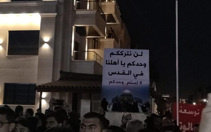 طالبب محتجون اردنيون مساء الأربعاء طرد السفير الاسرائيلي من عمان خلال وقفة من أمام مسجد الكالوتي من بعد صلاة التروايح لاعتداء جيش الإحتلال على المعتكفين واقتحام المسجد الأقصى .