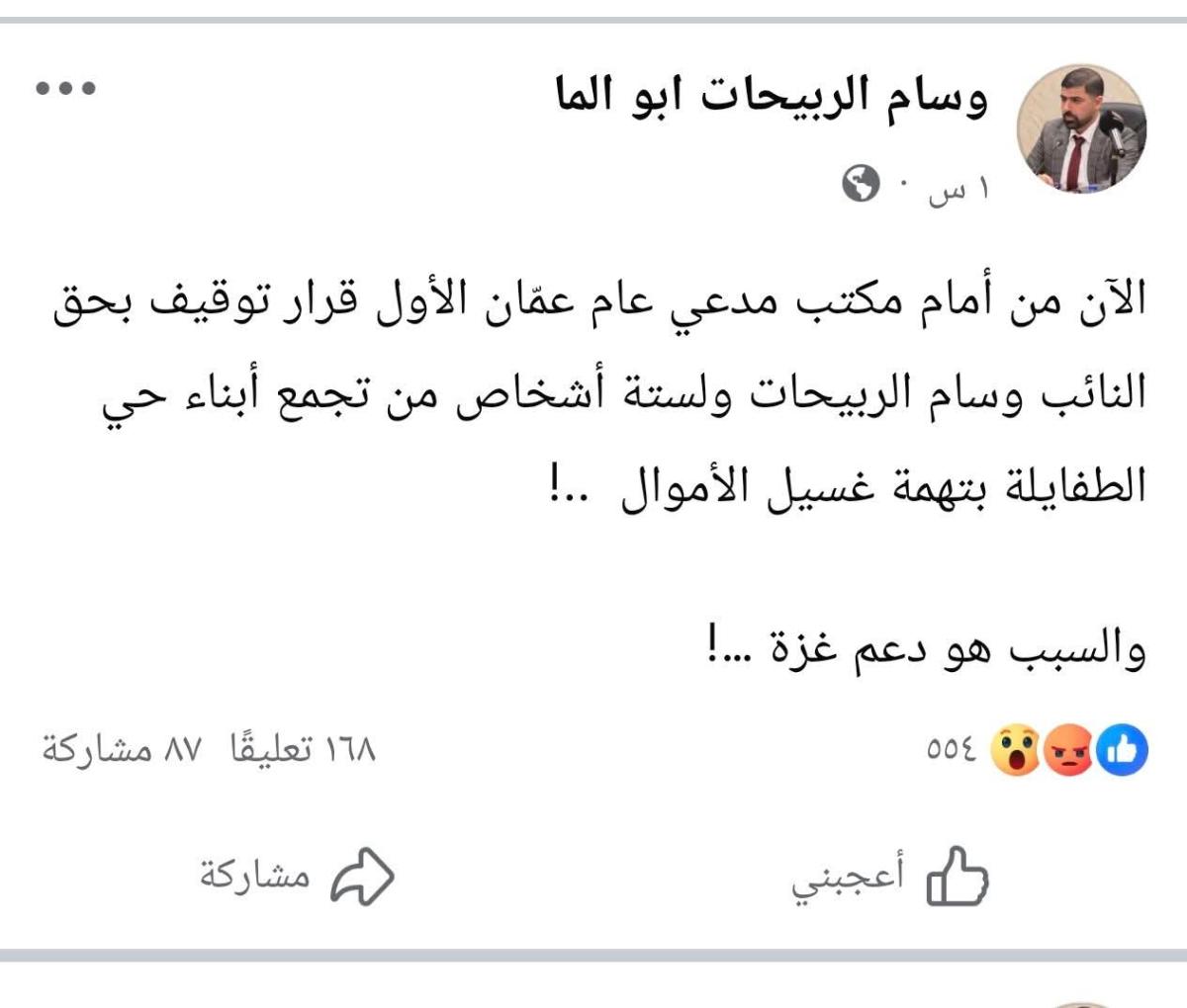 قرر مدعي عام عمان اليوم الثلاثاء توقيف النائب وسام اربيحات و5 آخرين لمدة 15 يوماً على ذمة التحقيق، بعد توجيه 4 تهم تتعلق بغسل الأموال ومخالفة قانوني التنمية الاجتماعية والجرائم الإلكترونية، وفق مصدر أفاد وكالة الأنباء الأردنية (بترا).