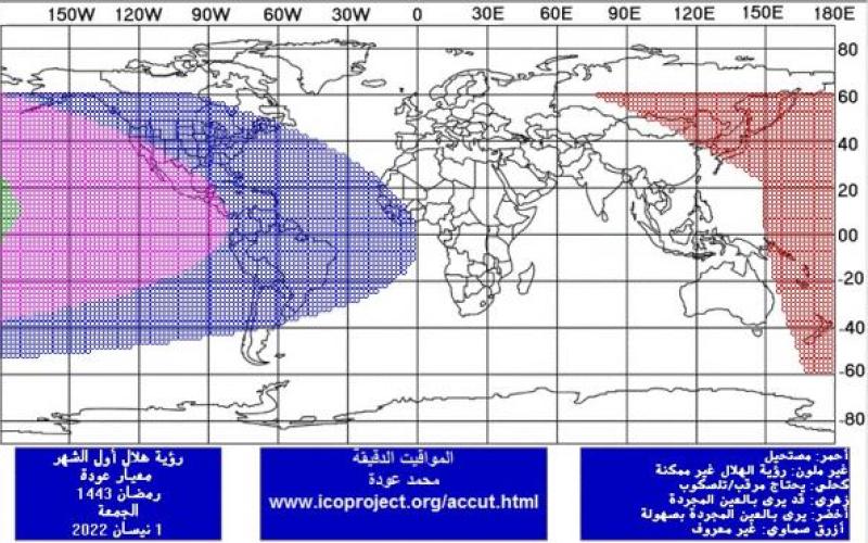 وأضاف "تشير الحسابات الفلكية إلى أن رؤية الهلال يوم الجمعة 01 نيسان غير ممكنة بالعين المجردة من أي مكان في العالم الإسلامي، في حين أنها ممكنة باستخدام التلسكوب فقط وبصعوبة بالغة من أطراف بسيطة من غرب القارة الأفريقية، فيما ستكون رؤية الهلال يومها ممكنة بالعين المجردة بصعوبة بالغة في أجزاء من القارتين الأمريكيتين. كما ستكون رؤية الهلال يومها ممكنة بصعوبة كبيرة باستخدام تقنية التصوير الفلكي في حالة الصفاء التام للغلاف الجوي فقط"..