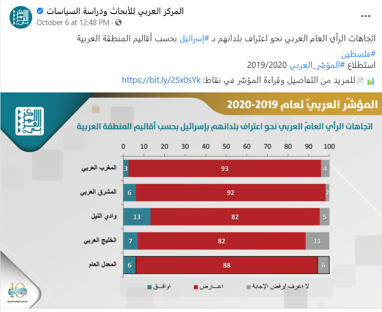 ولفت "مسبار" إلى استطلاع الرأي الصادر عن المركز العربي للأبحاث ودراسة السياسات، بتاريخ 6 أكتوبر/تشرين الأول الجاري، والّذي شمل 28 ألف مُشاركاً في 13 دولة عربية (لا يشمل الإمارات)، وجرى بين نوفمبر/تشرين الثاني عام 2019 ويوليو/تموز الجاري، حيث أظهرت نتائجه أنّ 88% من المواطنين العرب في البُلدان المُستطلعة ترفض الاعتراف بإسرائيل، من ضمنهم 85% من المصريين، و91% من الفلسطينيين، و93% من الأردنيين، و65% من السعوديين.