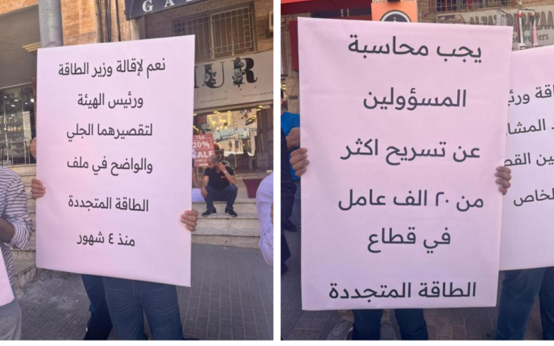 يبلغ عدد شركات الطاقة المتجددة في الأردن 460 شركة، وتشغل نحو 20 ألف عامل في وظائف مباشرة وغير مباشرة، إلا أن العديد من هذه الشركات اضطرت إلى تسريح ما بين 60% إلى 82% من موظفيها وتخفيض رواتب آخرين بسبب تأخير إصدار النظام الخاص بقانون الطاقة المتجددة لمدة ثلاثة أشهر، والذي صدر فقط مع بداية شهر أيلول الحالي، مما أدى إلى توقف أعمالها.