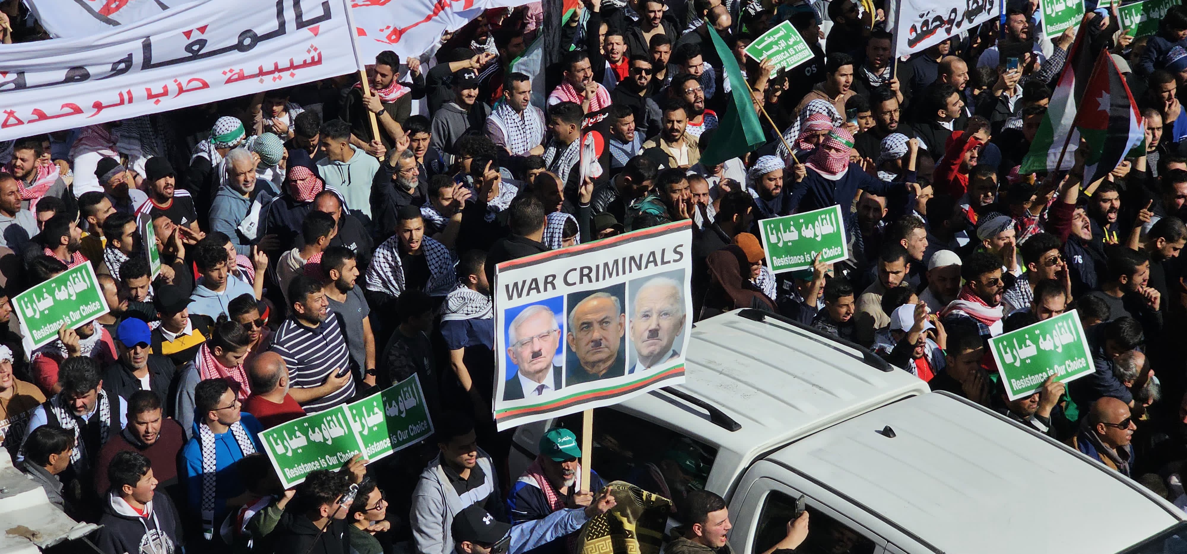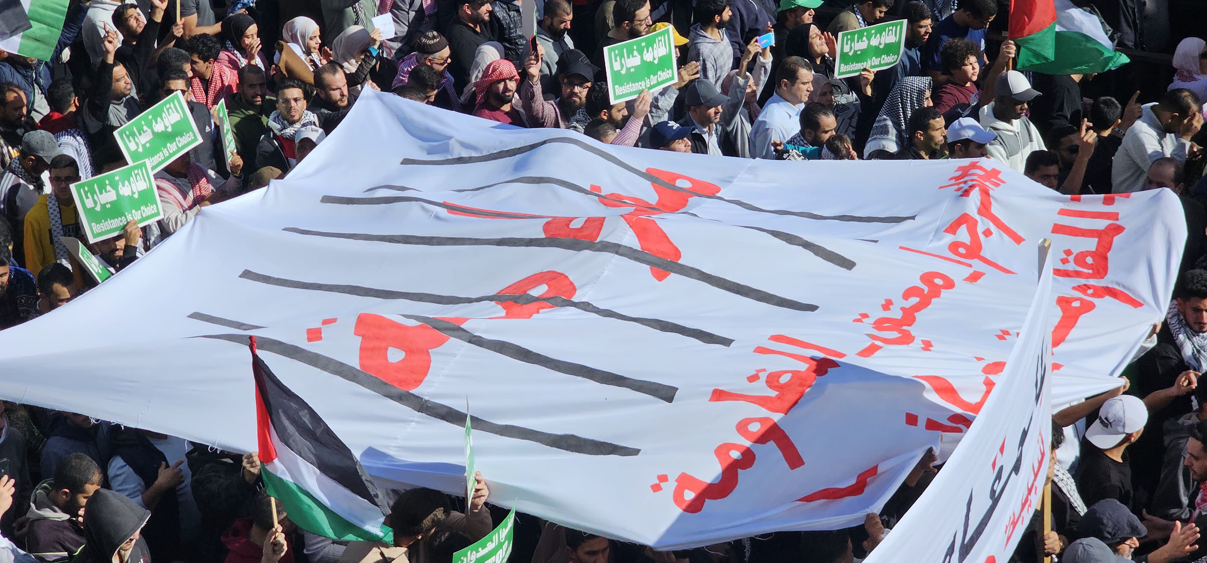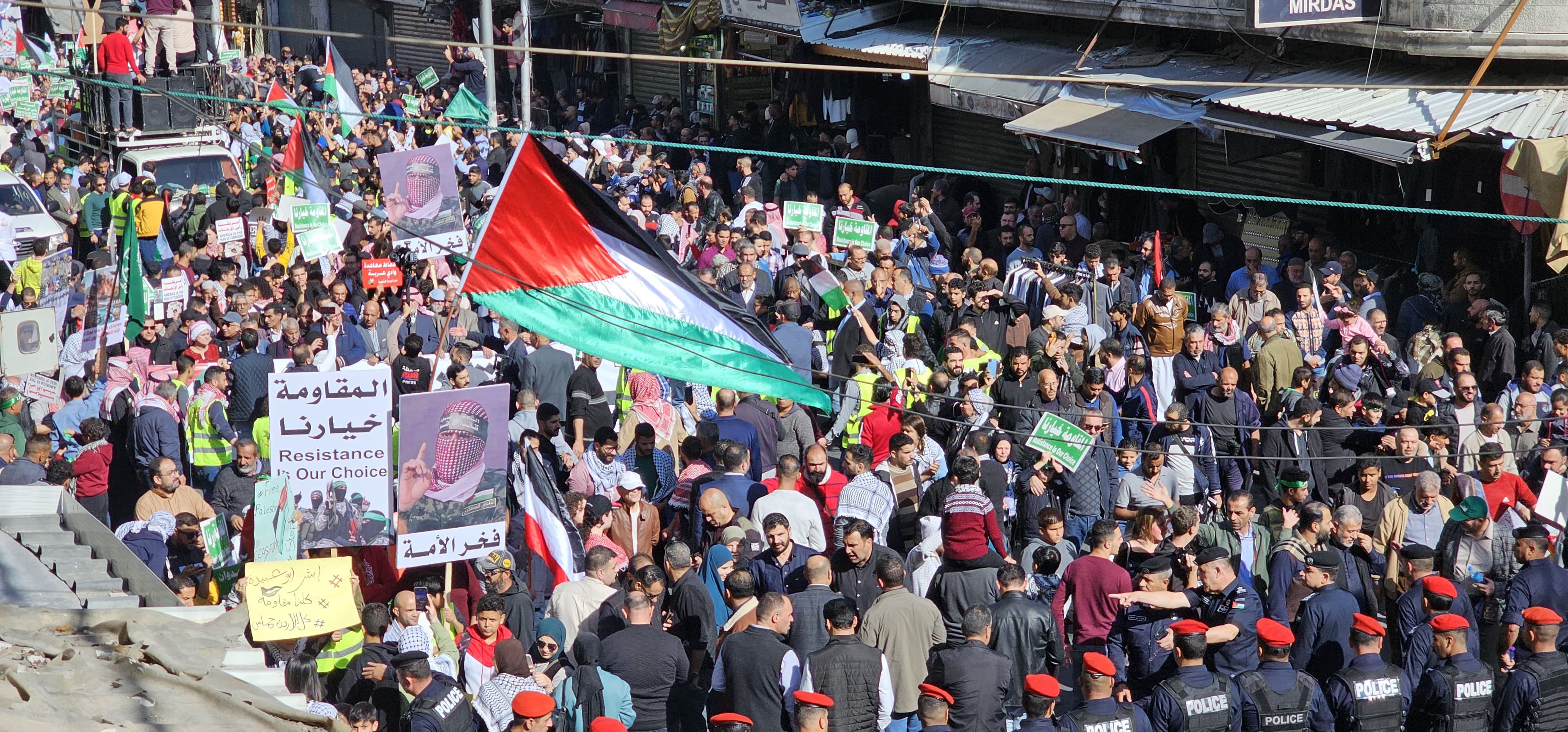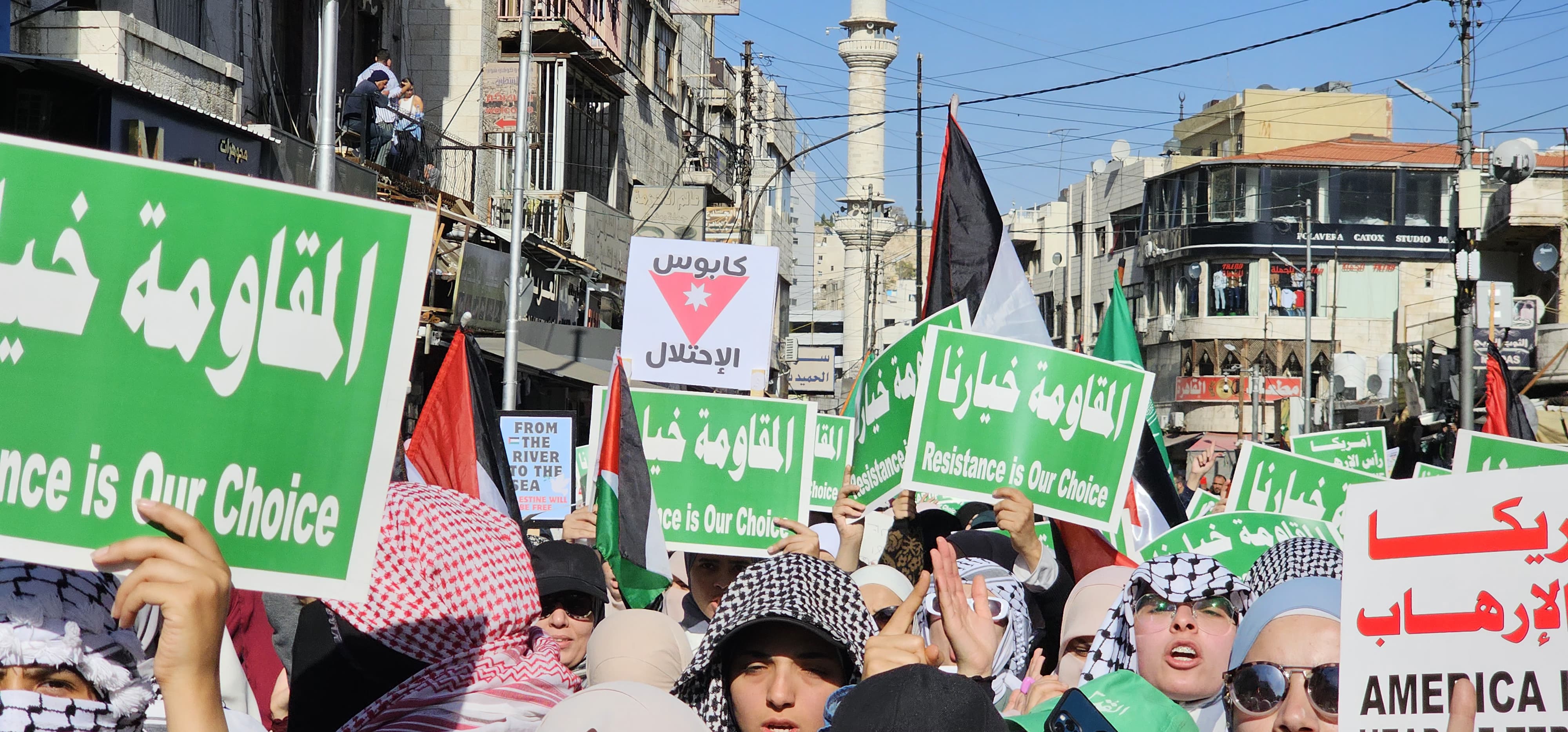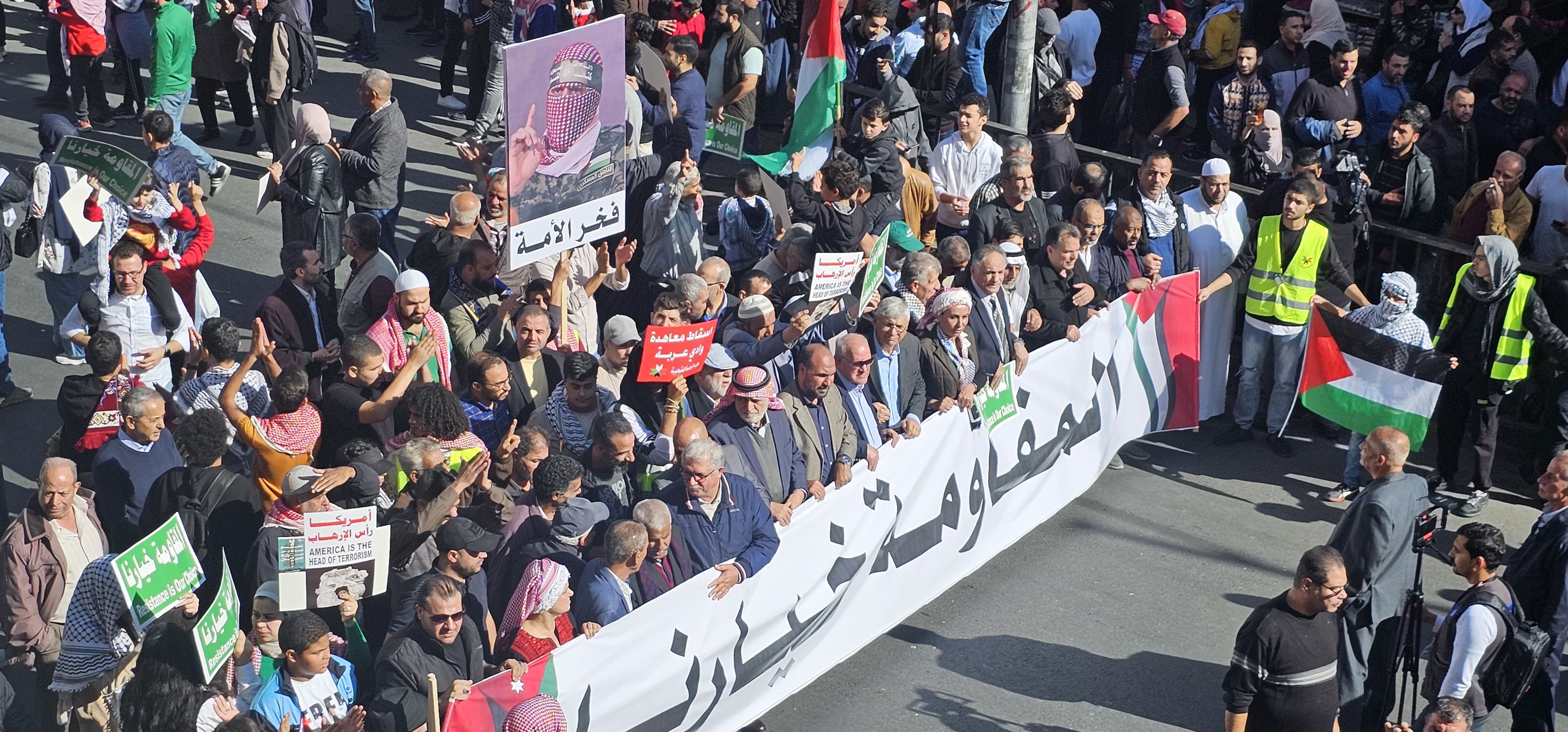 وشارك آلاف الأردنيين في مسيرة حاشدة انطلقت بعد صلاة ظهر الجمعة من أمام المسجد الجسيني بمنطقة وسط البلد ودعا إليها الملتقى الوطني لدعم المقاومة وحماية الوطن تحت شعار "المقاومة خيارنا".