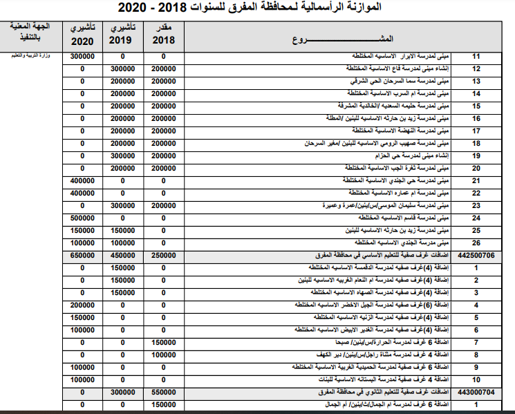 بعد تخصيص 5 مليون دينار، لمشاريع التربية والتعليم من موازنة مجلس محافظة المفرق عام 2018، قررت لجنة التربية إنشاء 16 مدرسة جديدة، وإضافة غرف صفية لمدارس أخرى داخل المحافظة.