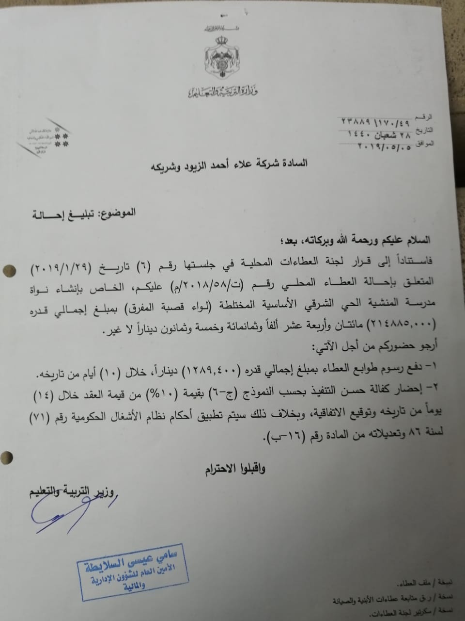 أبو الريش، يبين انّ مدرسة الخنساء أحيلت إلى وزارة الأشغال بحكم التكلفة التقديرية لها، في حين تكفلت ذات الوزارة بمدرستي الجندي والمنشية لانخفاض كل مشروع فيها عن السقف المحدد في نظام المشتريات الحكومية للعام 2019 حيث لا يسمح للوزارة التعامل مع مشروع تزيد تكلفته عن 500 ألف دينار.
