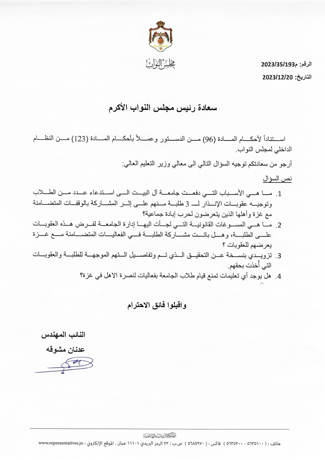وجه النائب عدنان مشوقه، اليوم، سؤال الى وزير التعليم العالي ، عن الاسباب التي دفعت جامعة آل البيت الى استدعاء عدد من الطلاب وتوجيه عقوبات الإنذار لـ 3 طلبة منهم على إثر المشاركة بالوقفات المتضامنة مع غزة، كما وتسأل عن المسوغات القانونية التي لجأت اليها إدارة الجامعة لفرض هذه العقوبات على الطلبة، وهل باتت مشاركة الطلبة في الفعاليات المتضامنة مع غزة يعرضهم للعقوبات.