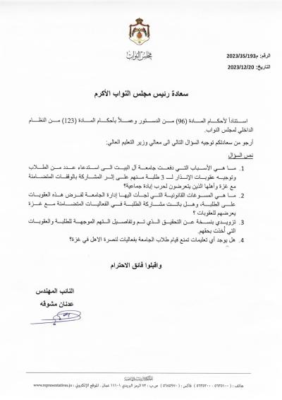 كما وطالب بتزويده بنسخة عن التحقيق الذي تم وتفاصيل التهم الموجهة للطلبة والعقوبات التي أُخذت بحقهم، واضاف متسائل هل يوجد أي تعليمات تمنع قيام طلاب الجامعة بفعاليات لنصرة الاهل في غزة.