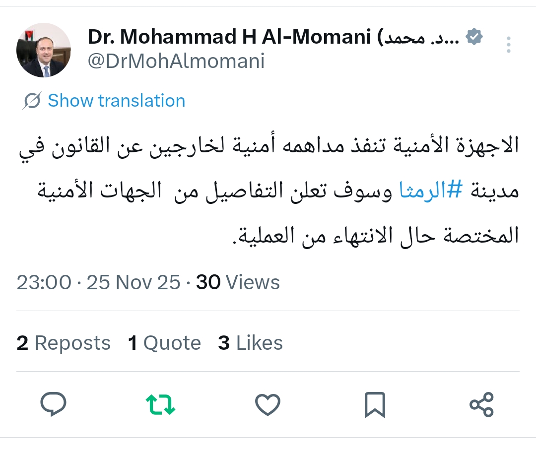 بينما قال وزير الاتصال الحكومي والناطق الرسمي باسم الحكومة في تغريدة له عبر موقع "اكس" ان الأجهزة الأمنية تنفذ مداهمة أمنية لخارجين عن القانون في لواء الرمثا.