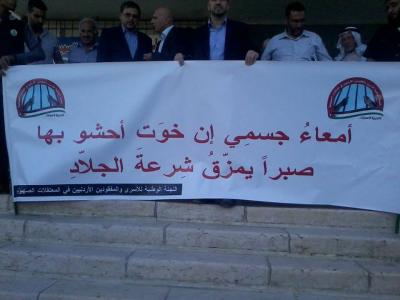 نظم العشرات وقفة تضامينة أمام مجمع النقابات مساء الأحد، للتأكيد على تضامنهم مع الأسيرين الأردنيين في سجون الاحتلال الإسرائيلي علاء حماد وحمزة الدباس وباقي الأسرى المضربين عن الطعام.