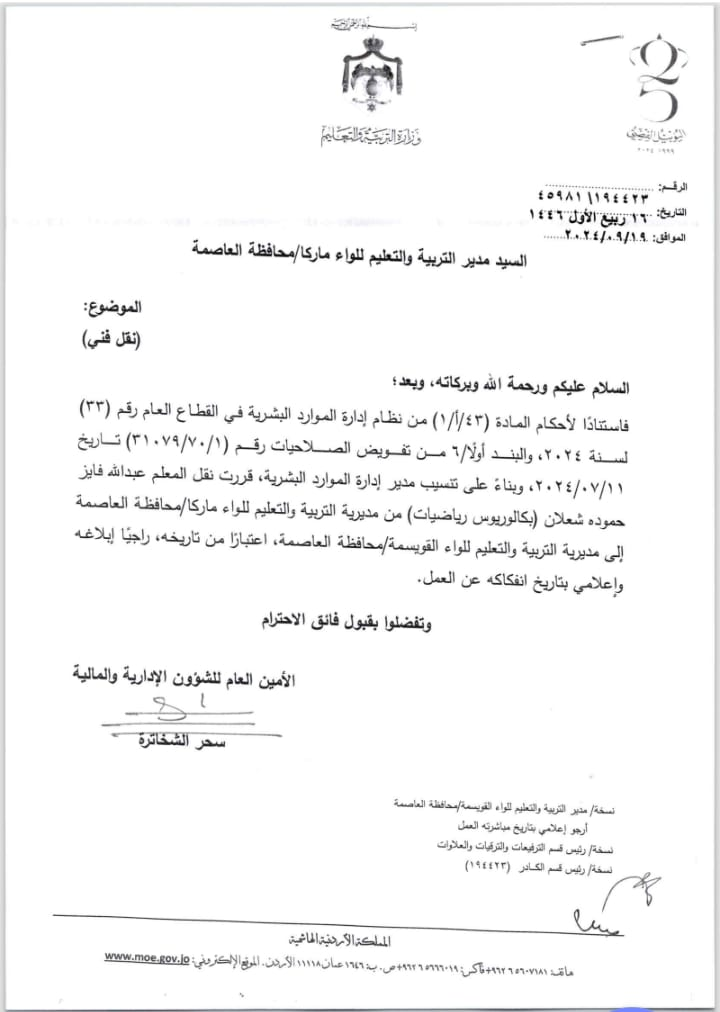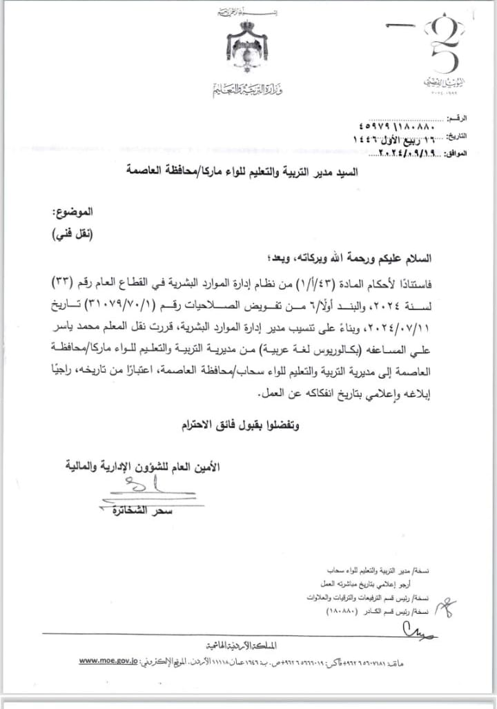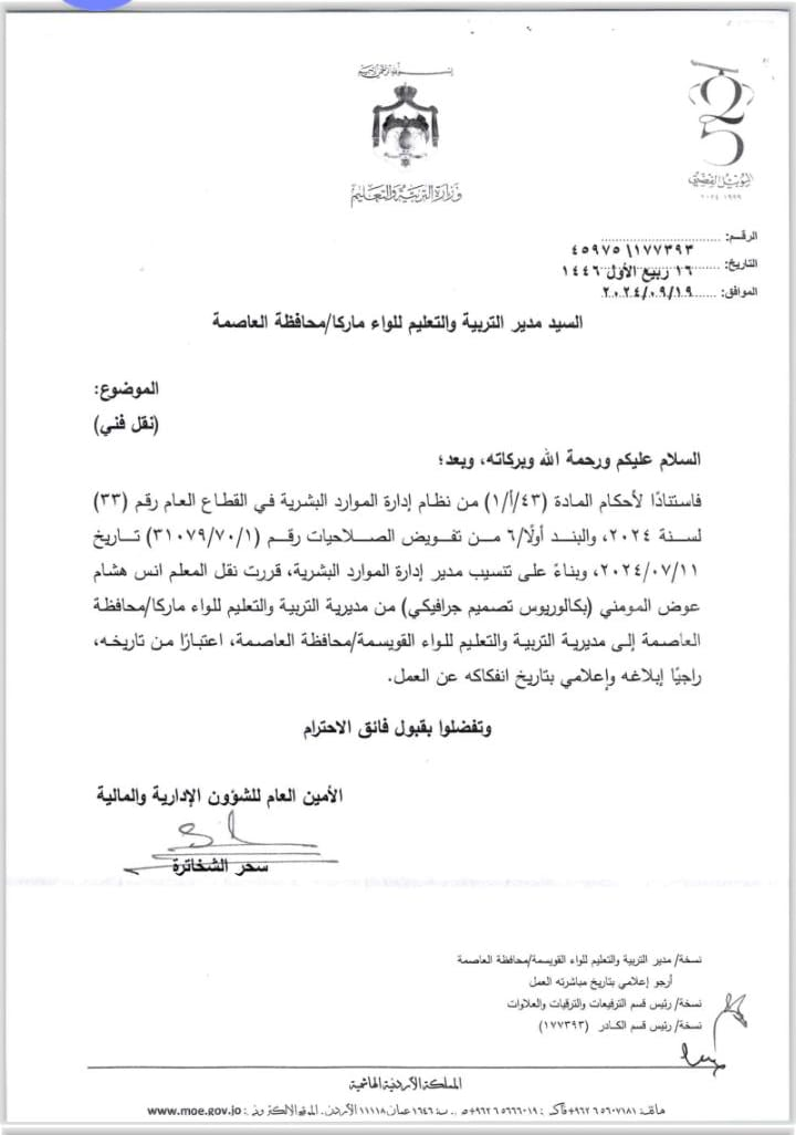 بناء على تنسيب من مديرية إدارة الموارد البشرية في وزارة التربية والتعليم، تم نقل 6 معلمين من مديرية التربية والتعليم للواء ماركا في محافظة العاصمة إلى مديريات تربية كل من لواء القويسمة، ولواء الجيزة، ولواء سحاب.