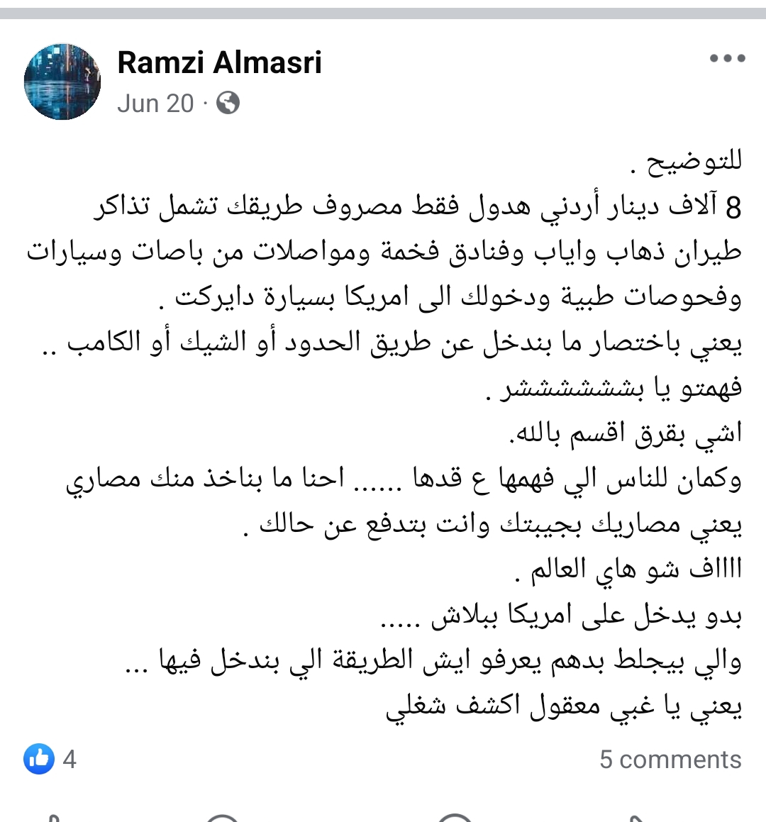 يقول "اي مكان أجمل من الاردن ليس لسوء تضاريس البلد، أنما لسوء إدارة الأزمات بالبلد ولانه الفساد لم يترك مجال لأصحاب الابداع ، والواسطة والمحسوبية دمرت البلد، منذ سنوات واحنا عايشين على الوعود الكاذبه انا تخرجت من جامعة اليرموك تخصص محاسبة ، بعد الجامعة بدأت بالتجارة بكل انواعها بالأردن ، ثم أتت جائحة كورونا ومع فساد البلد زاد الطين بلل وبدل ما اكون شب جاهز للأستقلال تحولت لشاب ممكن باي لحظة يسجن بسبب القضايا المالية".