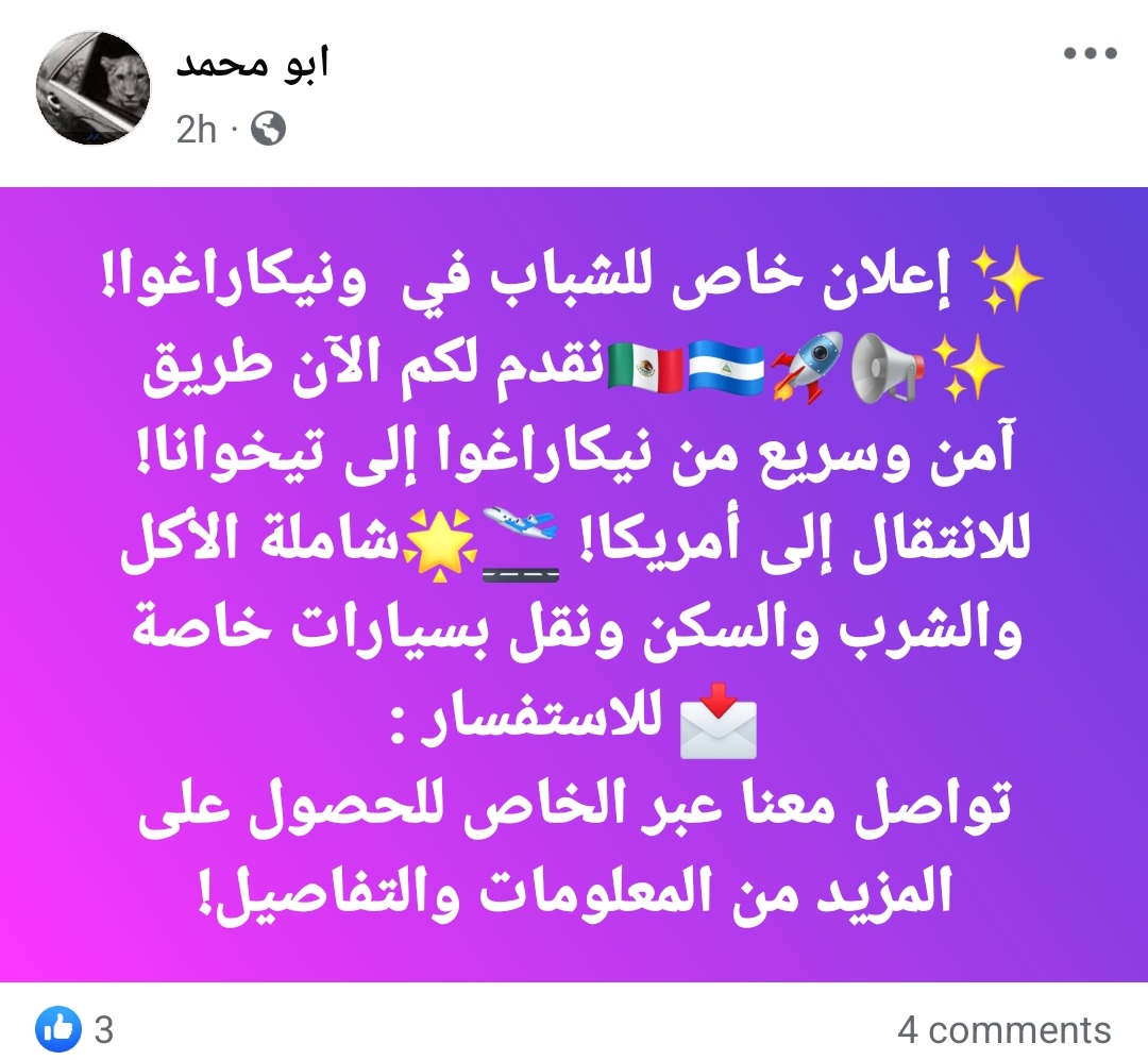 أبو أحمد (ليس اسمه الحقيقي)، أحد المهربين النشطين على مجموعات الفيسبوك، يروي لـ«ميدل إيست آي» عن طريقة التهريب: «تبدأ الرحلة بالسفر إلى ماناغوا عاصمة نيكاراغوا، إما عن طريق لندن أو إسطنبول أو مباشرة إلى ماناغوا،