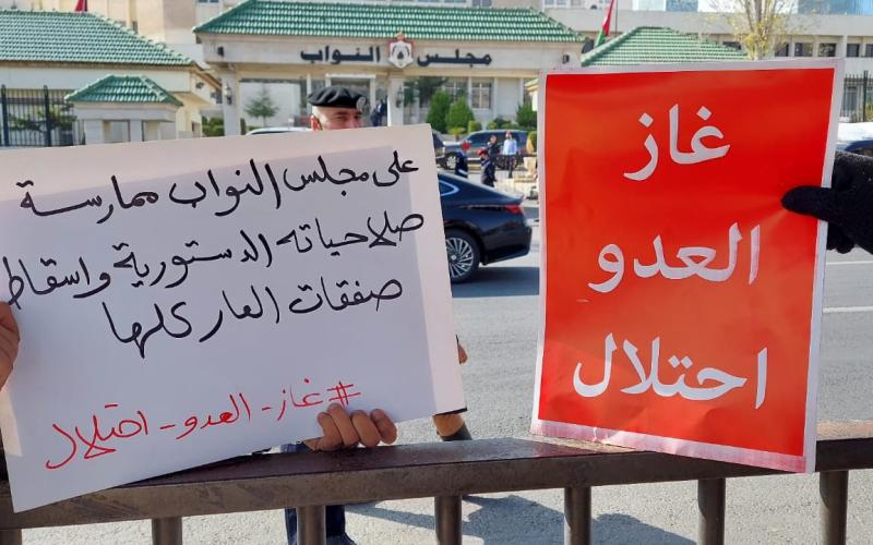 اعتصم في ناشطون أردنيون بالتزامن مع جلسة النواب الخاصة لمناقشة إعلان النوايا مع الاحتلال الإسرائيلي لتبادل الماء مقابل الكهرباء.