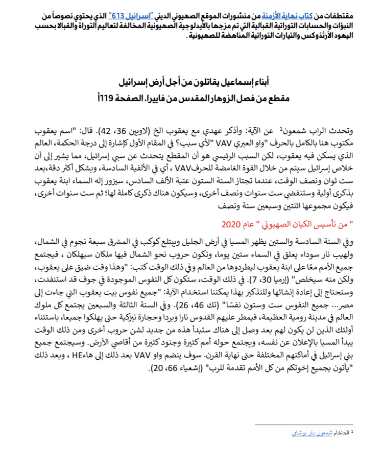 إن هذه النبؤات وغيرها وردت في كثير من النصوص الدينية التي يدرسها هؤلاء المتطرفون من حاخامات وسياسيين وجماهير ومن أبرزها كتاب "نهاية الأزمنة والفداء القادم " الذي جمع نبؤات متعددة من حاخامات يهود من القرن العاشر والسادس عشر الميلادي، مثل شمعون بار يوشاي وحاييم بن يوسف فيتال، نبؤات تم تفسيرها بناء على الطرح الصهيوني الديني، حيث تتحدث هذه النبؤات عن حرب كبرى تقوم بين "إبنة يعقوب " و"أبناء إسماعيل" تأخذ شكل التهديد الوجودي للكيان العبري، وبالتالي يجب على القائمين على قيادة الشعب العمل على تأجيجها، لأنه و في خضم هذه المعارك سوف يأتي المسيا وعند قدومه سوف يتجمع أبناء إسماعيل "العرب والمسلمين" على شعب الله المختار، ولكن الرب سوف ينفذ كلام حيث سيأتي "الرب" ويقوم بتخليص شعبه ومسيحه، وهذا يؤكد أن بنيامين نتنياهو -الذي قطع وعداً للحاخام شنيرسون بأن يعمل لإظهار المسيا- يقود نظاماً يستند في سياساته على فلسفة دينية بالتحالف مع رجال دين متطرفين يشرعنون الحركة الصهيونية ويجعلون لهذه الأيدلوجية "علمانية الأصل" صفة القداسة، وتمنح قادتها الحاليين حصانة شبه إلهية مسيانية.