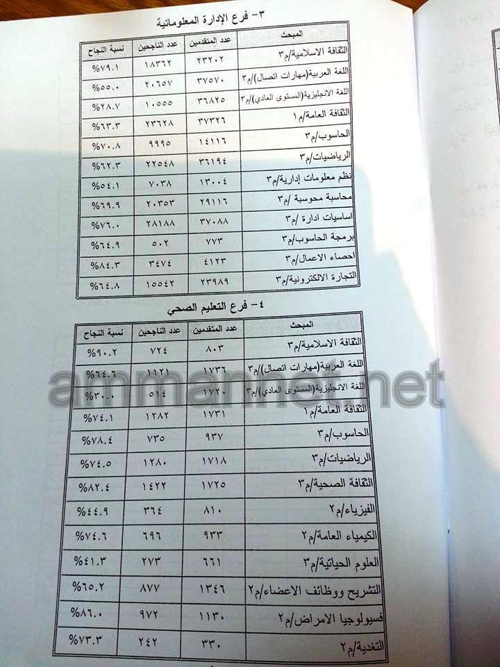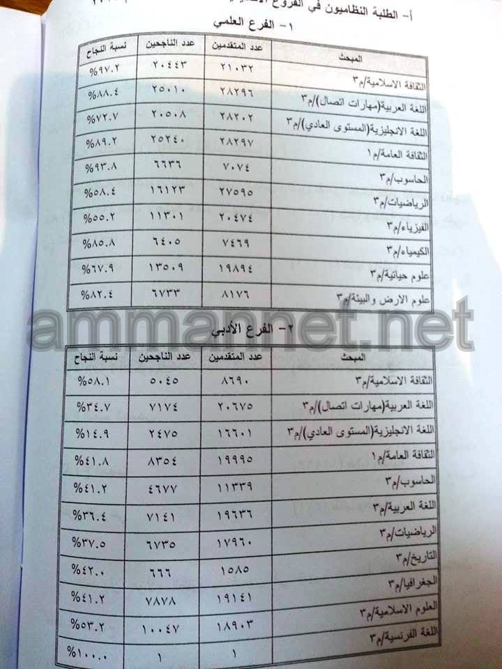 وحسب الذنيبات، فإن معدل النجاح بمادة اللغة الإنجليزية للفرع الأدبي بلغ 14 % فقط، بينما بلغت نسبة النجاح بمادة الفيزياء للفرع العلمي 55%، ونسبة النجاح في مادة اللغة العربية لفرع الإدارة المعلوماتية 55% ..