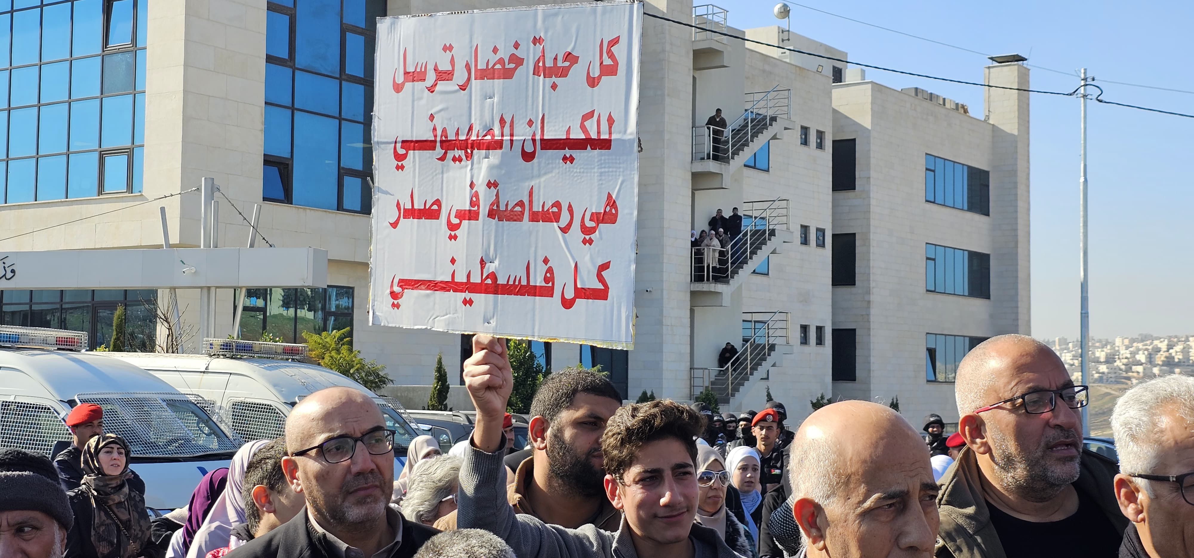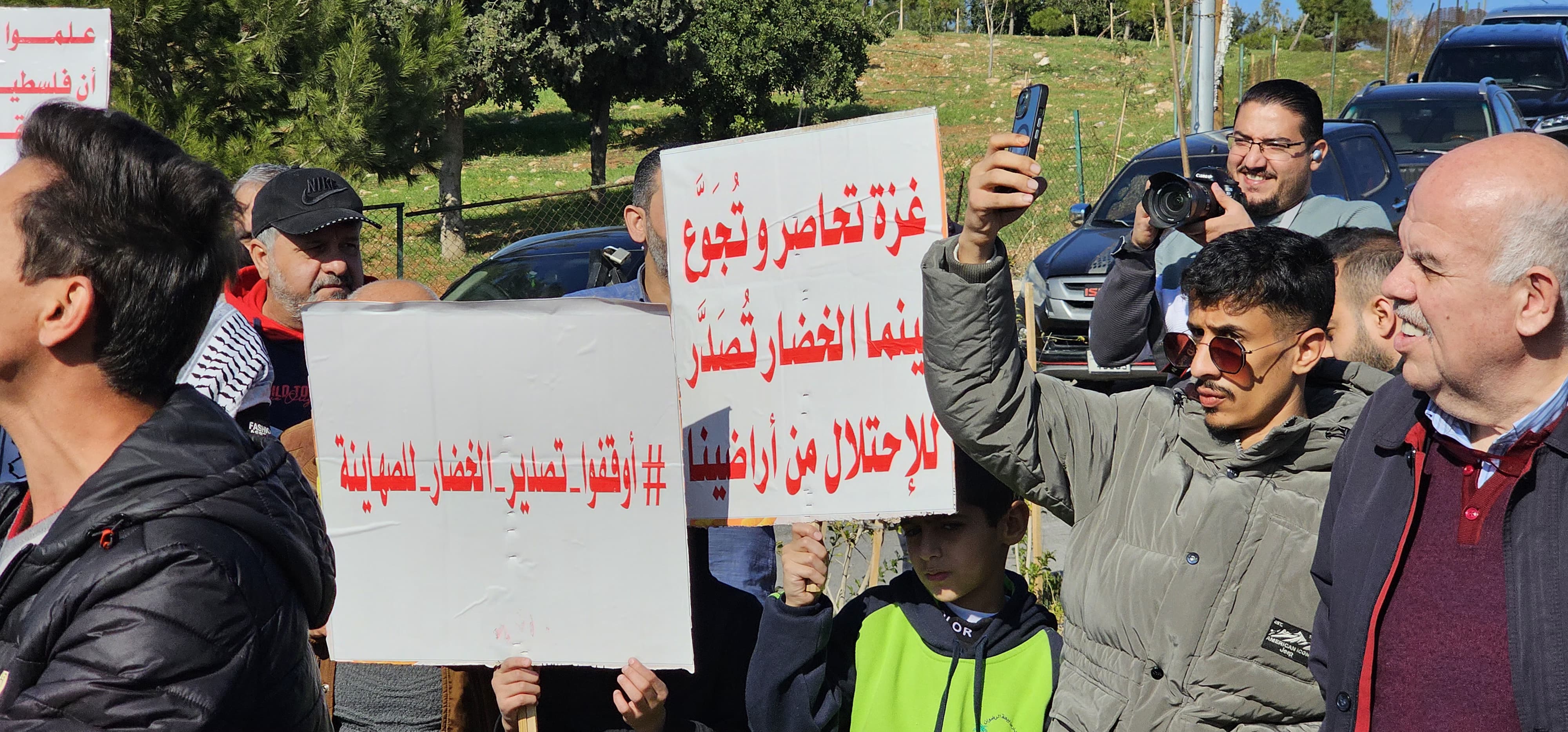 ورفع المحتجون أمام وزارة الزراعة شعارًا منددًا باستمرار التطبيع الزراعي مع الكيان الصهيوني المجرم، ورددوا شعارات: “غزة تحاصر وُتجوّع بينما الخضار تُصدر للاحتلال من أراضينا”، و”أوقفوا تصدير الخضروات للكيان الصهيوني”.