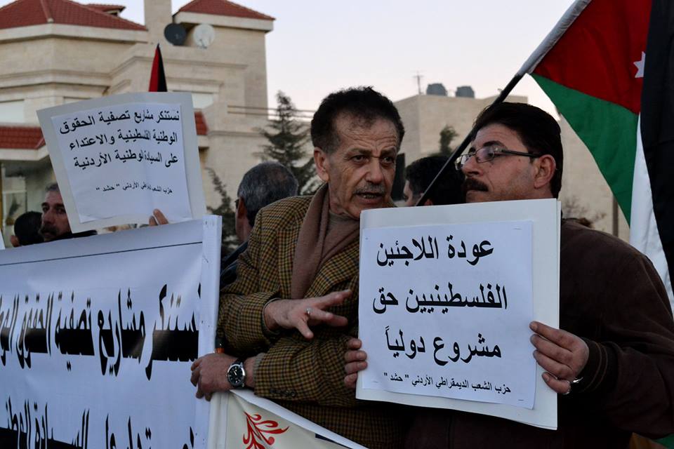 وقال المنظمون ان وقفتهم جاءت للتأكيد على رفضهم لمخطط وزير الخارجية الامريكي جون كيري الداعي لتوطين اللاجئين الفلسطينيين وحرمانهم من حق العودة ،بالاضافة لرفضهم فكرة اقامة الوطن البديل في الاردن.