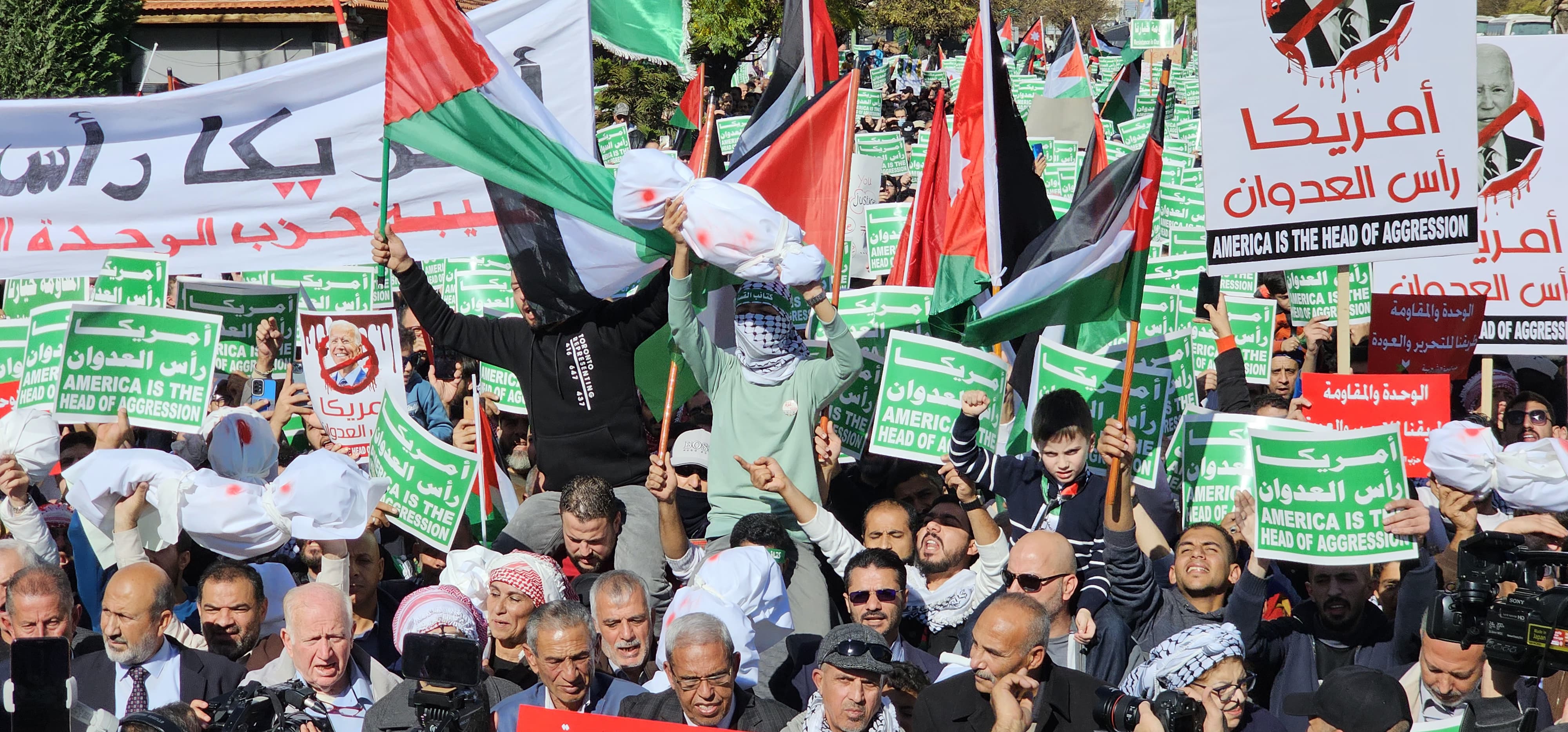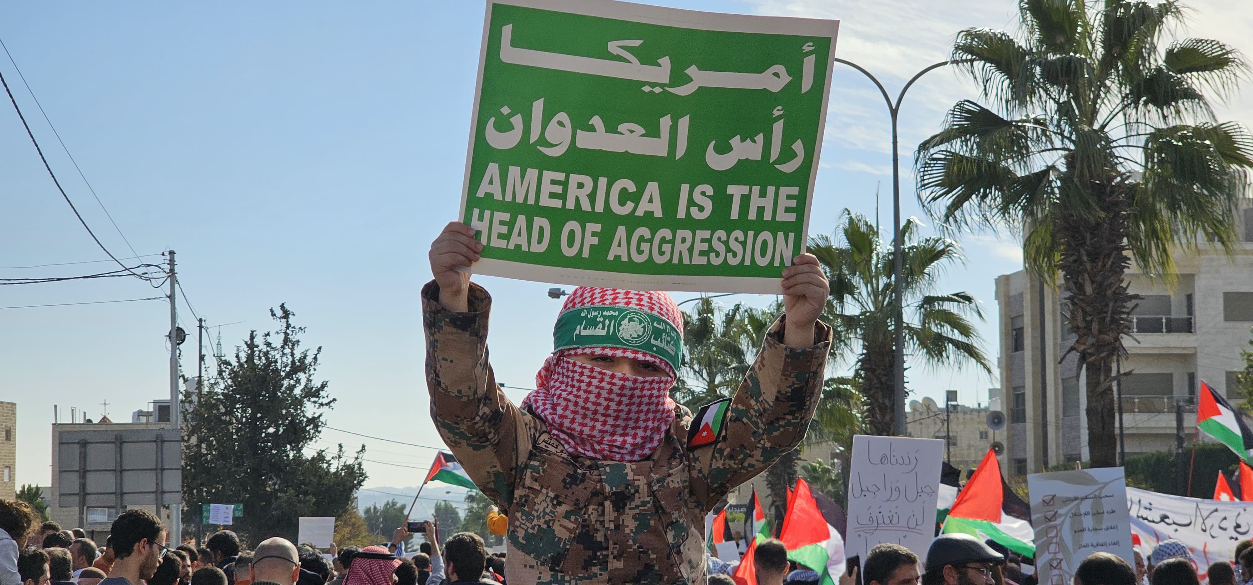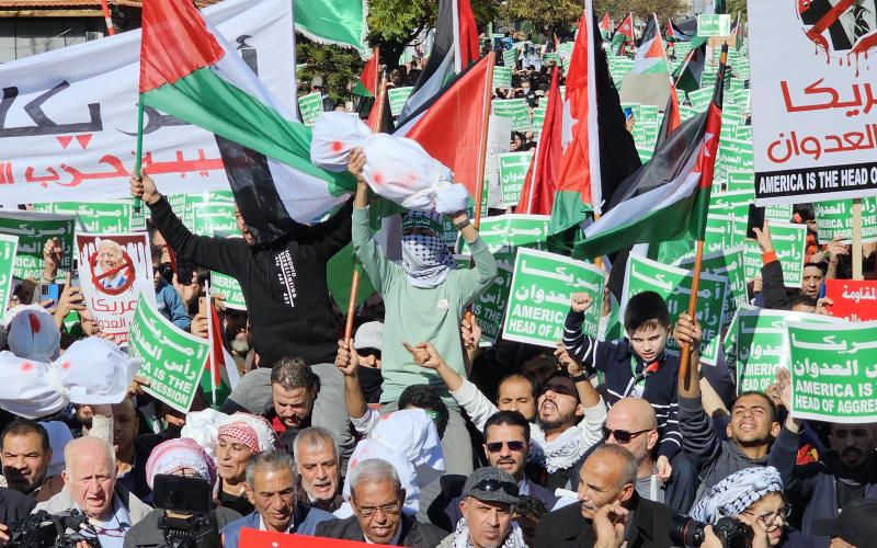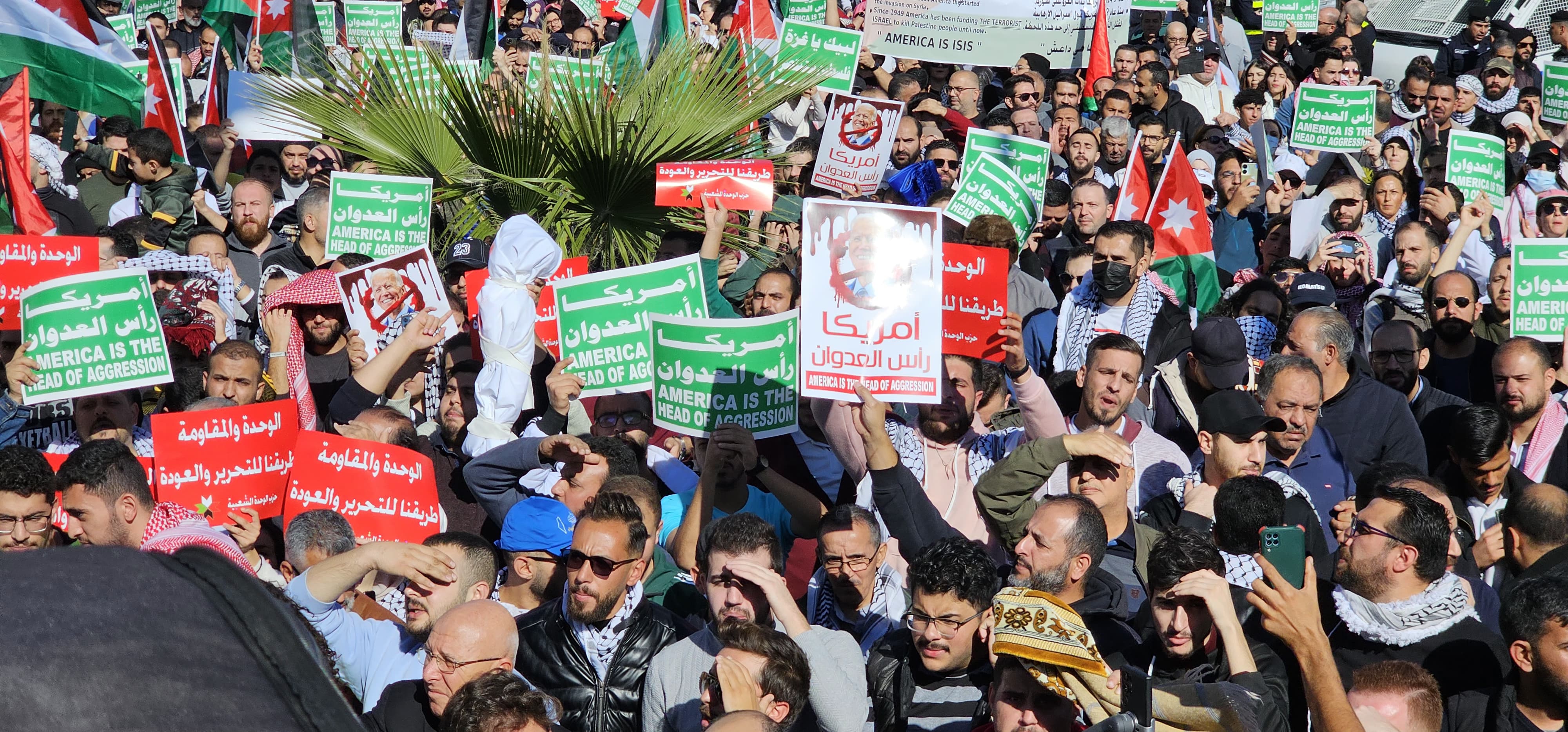 شارك آلاف الأردنيين في الفعالية الحاشدة التي أقيمت بعد صلاة ظهر الجمعة أمام مسجد عباد الرحمن بمنطقة الصويفية (على بُعد 2 كم من السفارة الأمريكية) تحت عنوان (أمريكا رأس العدوان)، وذلك تنديدا بموقف الولايات المتحدة من الإبادة الجماعية التي يتعرّض لها الأهل في قطاع غزة.