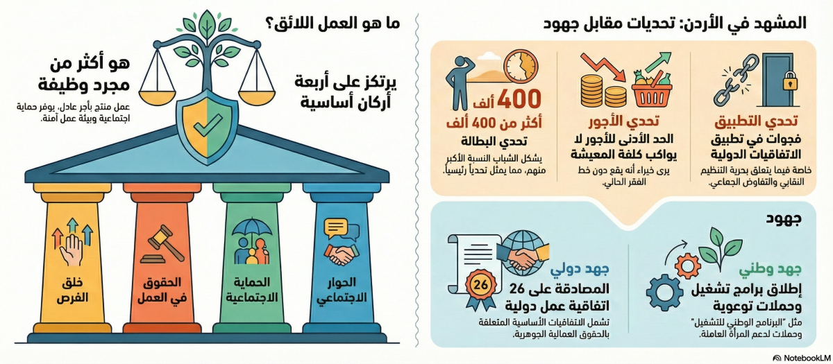 ويرتكز مفهوم العمل اللائق، وفق المعايير الدولية، على أربع قواعد أساسية، هي توفير فرص عمل منتجة ومستدامة، واحترام الحقوق الأساسية في العمل مثل الأجور العادلة والمساواة وعدم التمييز وحرية التنظيم النقابي، وشمول العاملين بأنظمة الحماية الاجتماعية كـالضمان الاجتماعي، إضافة إلى حوار اجتماعي فعّال قائم على التشاور المستمر بين الحكومة وأصحاب العمل والعمال.