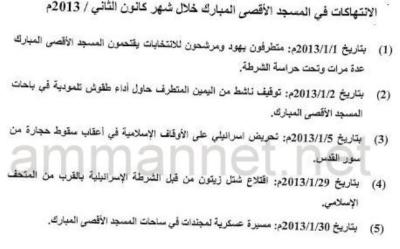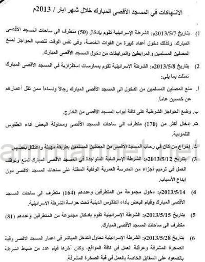بلغ عدد الانتهاكات التي تعرض لها المسجد الأقصى خلال عام 2013 من قبل المستوطنين والسلطات الإسرائيلية 63 انتهاكاً، تصدرها شهر أيلول الماضي بـ11 انتهاكاً؛ بحسب دائرة شؤون القدس والأقصى في وزارة الأوقاف.