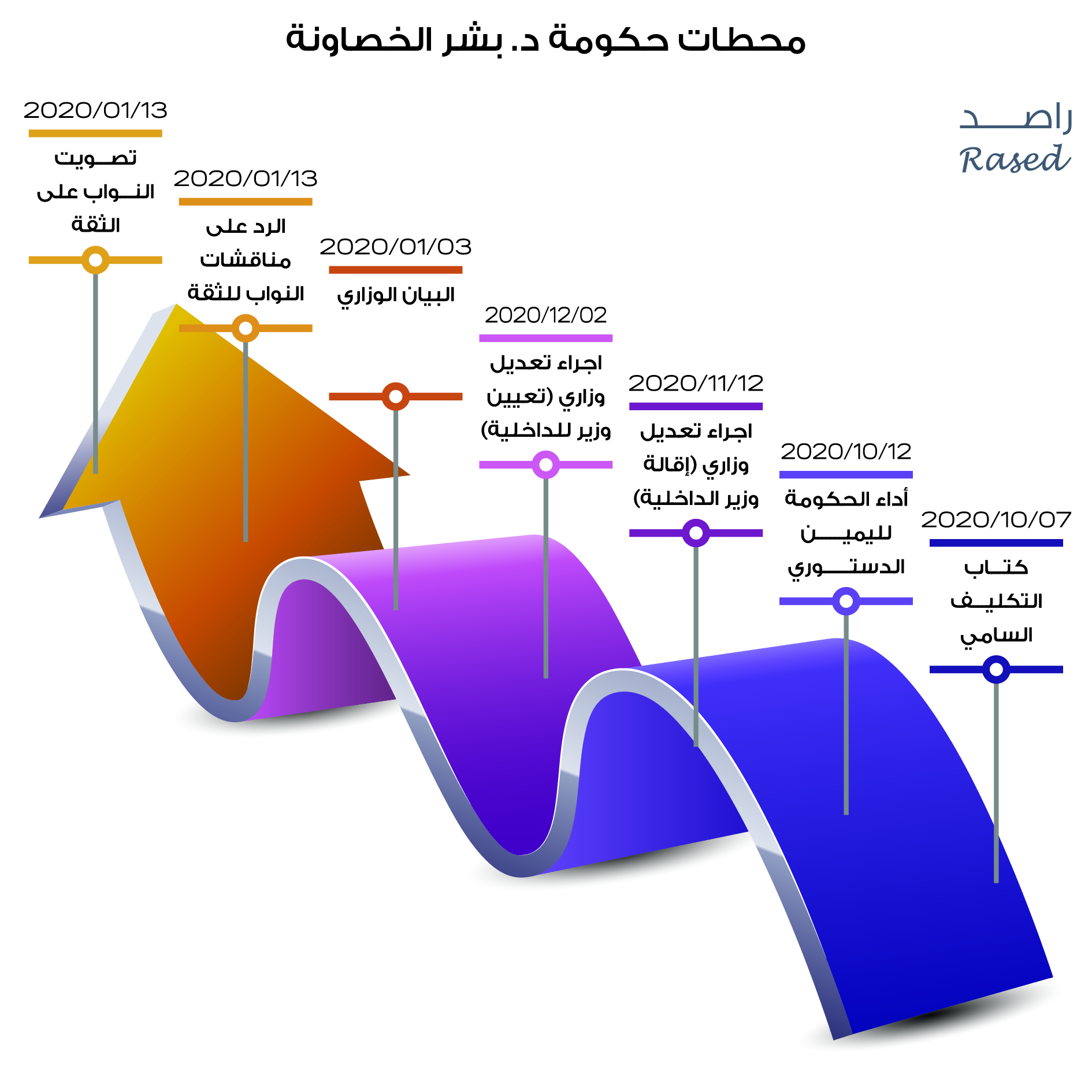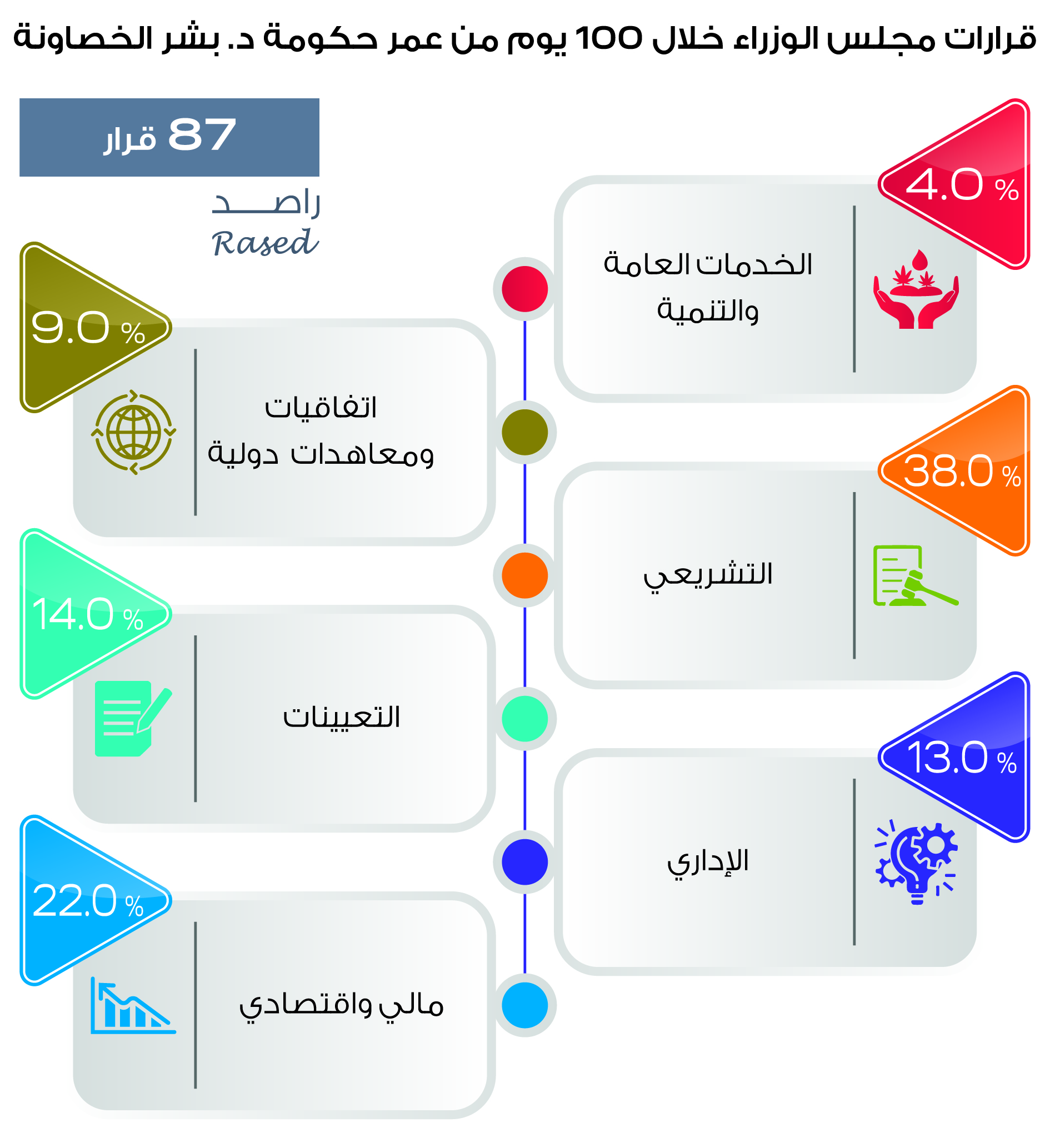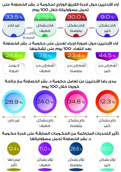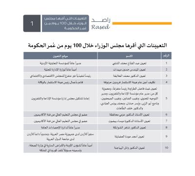 أصدر برنامج راصد لمراقبة الأداء الحكومي تقريره الأول الخاص بمراقبة أداء حكومة الدكتور بشر الخصاونة وذلك بعد مضي 100 يوم على تشكيلها، واستمرت فترة التقرير من 12/10/2020 ولغاية 20/1/2021، وتم اعتماد منهجية تتبع الالتزامات التي قدمتها الحكومة خلال الـ 100 يوم وتوزيعها على سبعة محاور رئيسية وسيتم التحقق من إنجاز الالتزامات ضمن التقرير الدوري الذي سيصدره راصد حول مراقبة أداء الحكومة، كما احتوى التقرير القرارات التي اتخذتها الحكومة من خلال مجلس الوزراء وتوزيعها على مجموعة من المحاور، ويقدم التقرير التعيينات التي تم إقرارها من خلال مجلس الوزراء، ويتضمن التقرير استطلاعاً الكترونياَ حول 100 يوم على حكومة الخصاونة، حيث وصلت العينة المستجيبة إلى 1722 مستجيباً ومستجيبة موزعين على كافة محافظات المملكة.