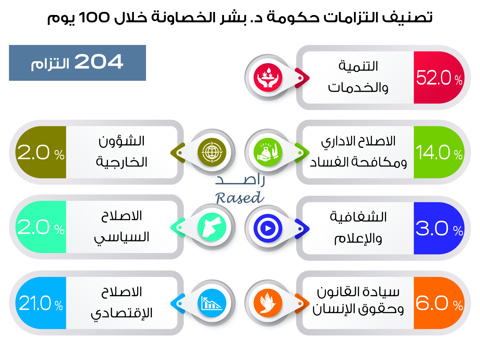 204 التزام قدمتهم الحكومة خلال 100 يوم، 52% منهم ضمن محور التنمية والخدمات.