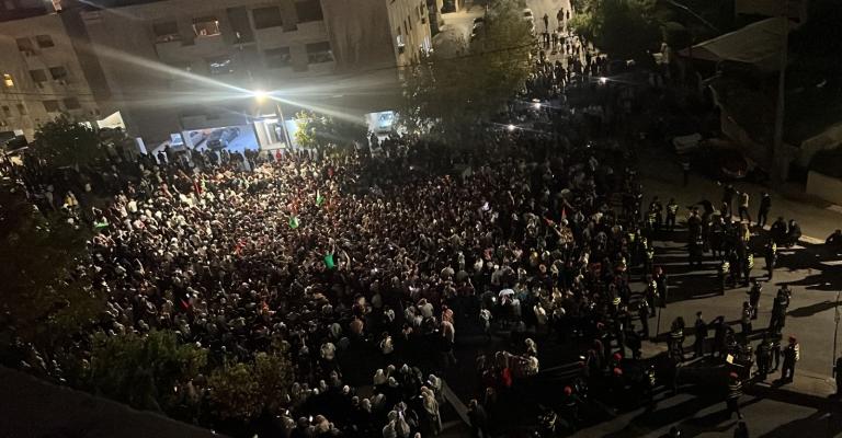 تجددت الاحتجاجات أمام سفارة الكيان الصهيوني مساء الجمعة، إثر تصاعد القصف الإجرامي على قطاع غزة وسط انقطاع كامل للاتصالات والانترنت. واحتشد الأردنيون أمام السفارة بعد يوم حافل بالمسيرات الحاشدة وسط