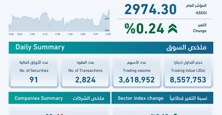 بلغ حجم التداول الإجمالي في بورصة عمان اليوم الأحد، 8.6 مليون دينار وعدد الأسهم المتداولة 3.6 مليون سهم، نفذت من خلال 2824 عقداً. وبحسب بيان للبورصة فقد ارتفع الرقم القياسي العام لأسعار الأسهم لإغلاق