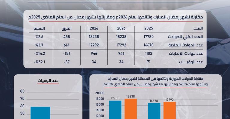 أظهرت الإحصائية الرسمية الصادرة عن إدارة السير حول حوادث المرور خلال شهر رمضان المبارك لعام 2026، انخفاضاً جوهرياً ومبشراً في أعداد الوفيات والإصابات البشرية مقارنة بالفترة ذاتها من العام الماضي 2025