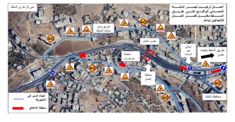 أعلنت وزارة الأشغال العامة والإسكان وبالتعاون مع إدارة السير عن بدء تنفيذ أعمال تركيب جسر مشاة معدني على طريق عمان-السلط مقابل قصر العدل في محافظة البلقاء، حيث ستشمل هذه الأعمال إغلاقاً مؤقتاً لحركة