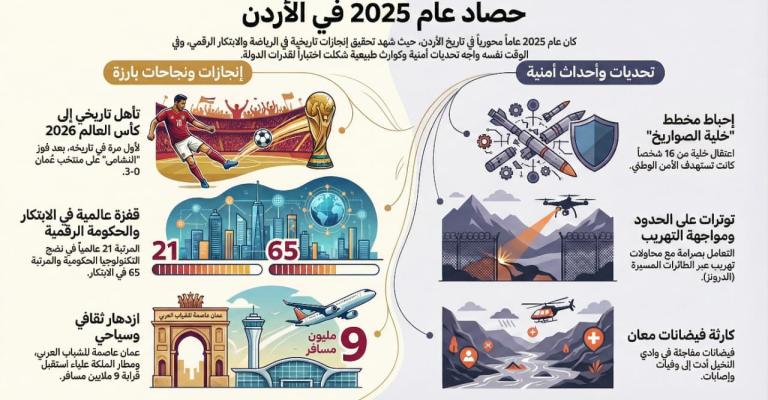 رغم غياب الأحداث السياسية الكبرى على الساحة الداخلية خلال عام 2025، إلا أن المشهد الأردني تأثر بشكل ملحوظ بتطورات أمنية متسارعة وتداعيات إقليمية ودولية انعكست على مختلف المستويات السياسية والاقتصادية