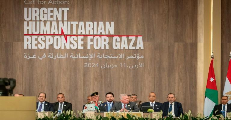 انعقد مؤتمر الاستجابة الإنسانية الطارئة في غزة رفيع المستوى في منطقة البحر الميت بالأردن في 11 حزيران/يونيو 2024، برئاسة مشتركة بين جلالة الملك عبدالله الثاني ابن الحسين، ملك المملكة الأردنية الهاشمية