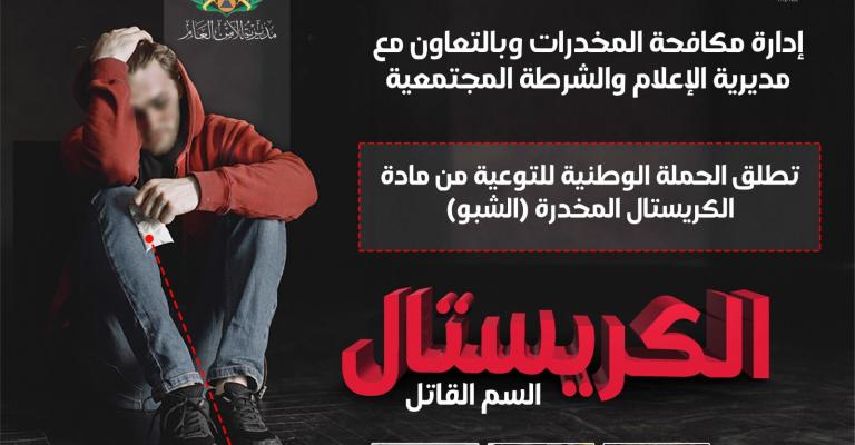 إدارة مكافحة المخدرات تطلق حملة توعوية ضد مادة الكريستال القاتلة، وتطلب من الجميع المساهمة بها والإبلاغ عن أي نشاط يرتبط بها ** مادة الكريستال أو الشبوة أو مخدر الشيطان أو الآيس هي مسميات لمادة