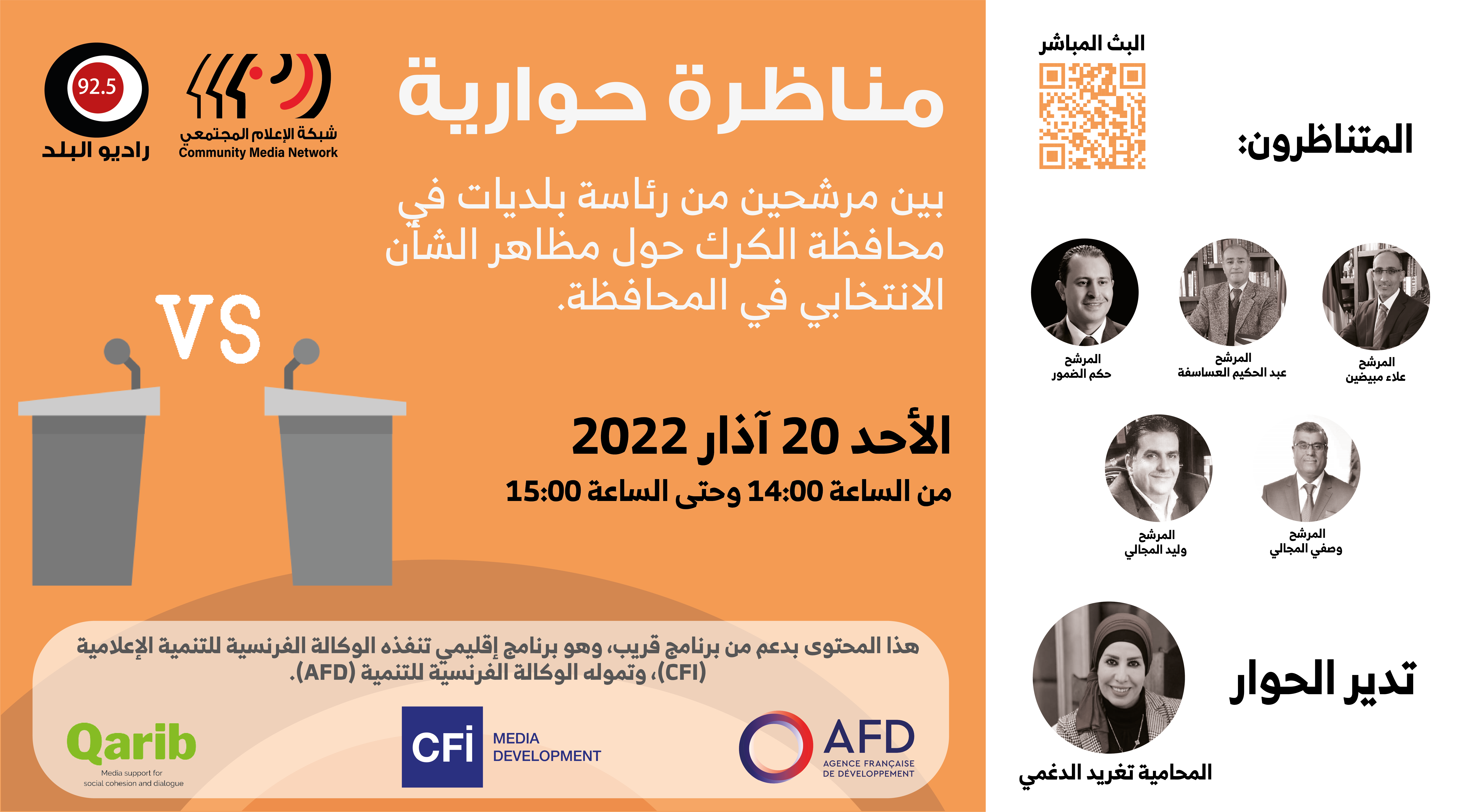 مناظرة حوارية بين مرشحين من رئاسة بلديات في محافظة الكرك، حول مظاهر الشأن الانتخابي في المحافظة. وذلك من الساعة 2:00 وحتى 3:00 من ظهر اليوم.