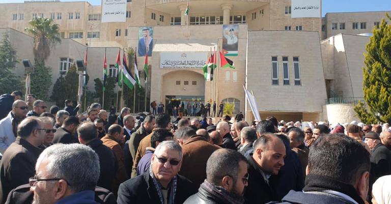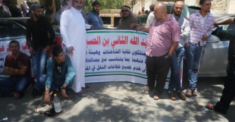 اعتصم مجموعة من أعضاء نقابة أصحاب الشاحنات أمام وزارة النقل للمطالبة بتنظيم حصة دور الأفراد والبالغة 70% على جميع ما ورد لميناء العقبة بحيث تكون هذه النسبة مستحقةً للأفراد ، وأكد المعتصمون أن وعود