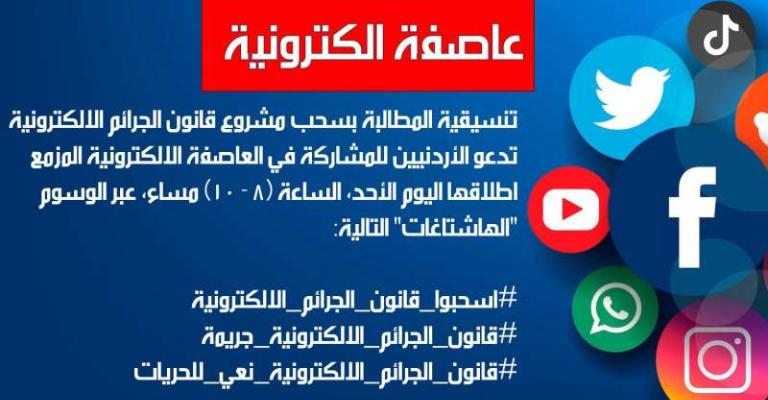 عاصفة إلكترونية على مواقع التواصل تحت أكثر من هاشتاق اسحبو قانون الجرائم الالكترونية ، قانون الجرائم الالكترونية جريمة، قانون الجرائم الالكترونية نعي للحريات. و تفاعل معها صحفيين و رواد مواقع التواصل