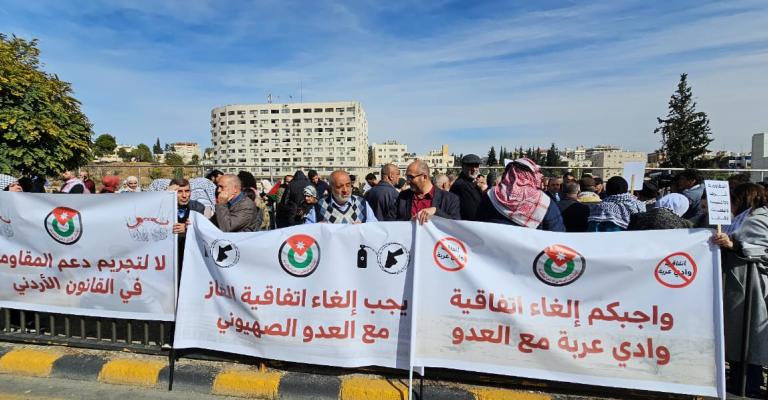 اعتصم الملتقى الوطني لدعم المقاومة، والحملة الوطنية الأردنية لإسقاط اتفاقية الغاز مع العدو، أمام مجلس النواب، صباح اليوم، بالتزامن مع جلسة مجلس النواب الرقابية لمناقشة رد الحكومة على 20 سؤالا نيابيا