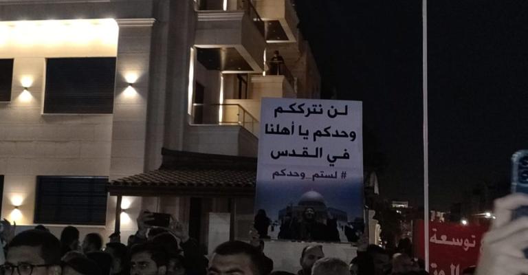 طالبب محتجون اردنيون مساء الأربعاء طرد السفير الاسرائيلي من عمان خلال وقفة من أمام مسجد الكالوتي من بعد صلاة التروايح لاعتداء جيش الإحتلال على المعتكفين واقتحام المسجد الأقصى . وردد المشاركون في